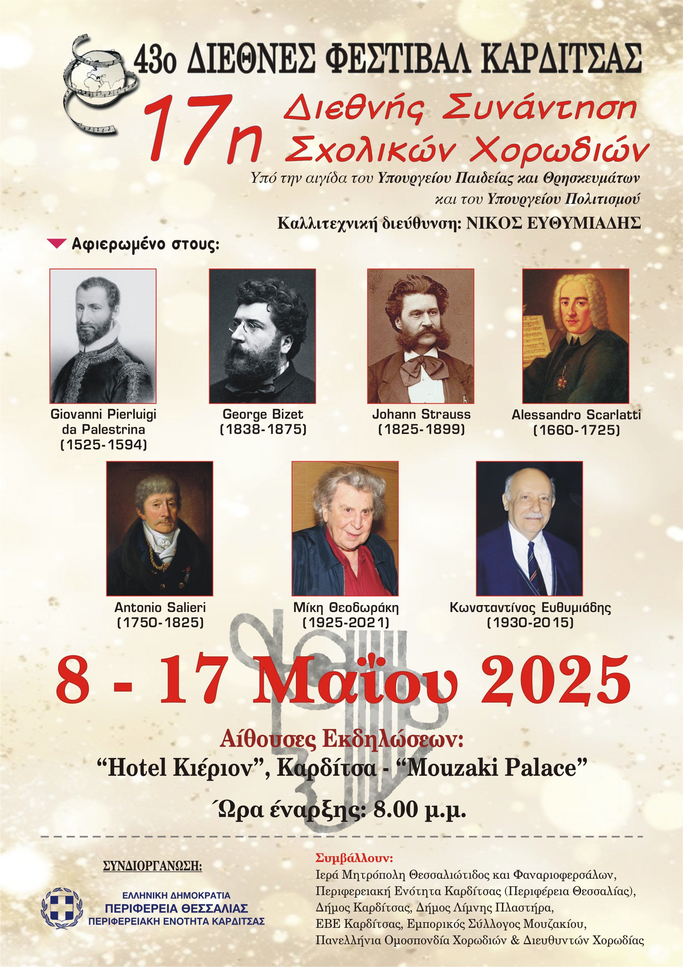 Το 43ο Διεθνές Φεστιβάλ Καρδίτσας, που θα πραγματοποιηθεί από την Πέμπτη 8 έως το Σάββατο 24 Μαϊου 2025 είναι αφιερωμένο επίσης στους Μίκη Θεοδωράκη, George Bizet, Αlessandro Scarlati και Antonio Salieri.