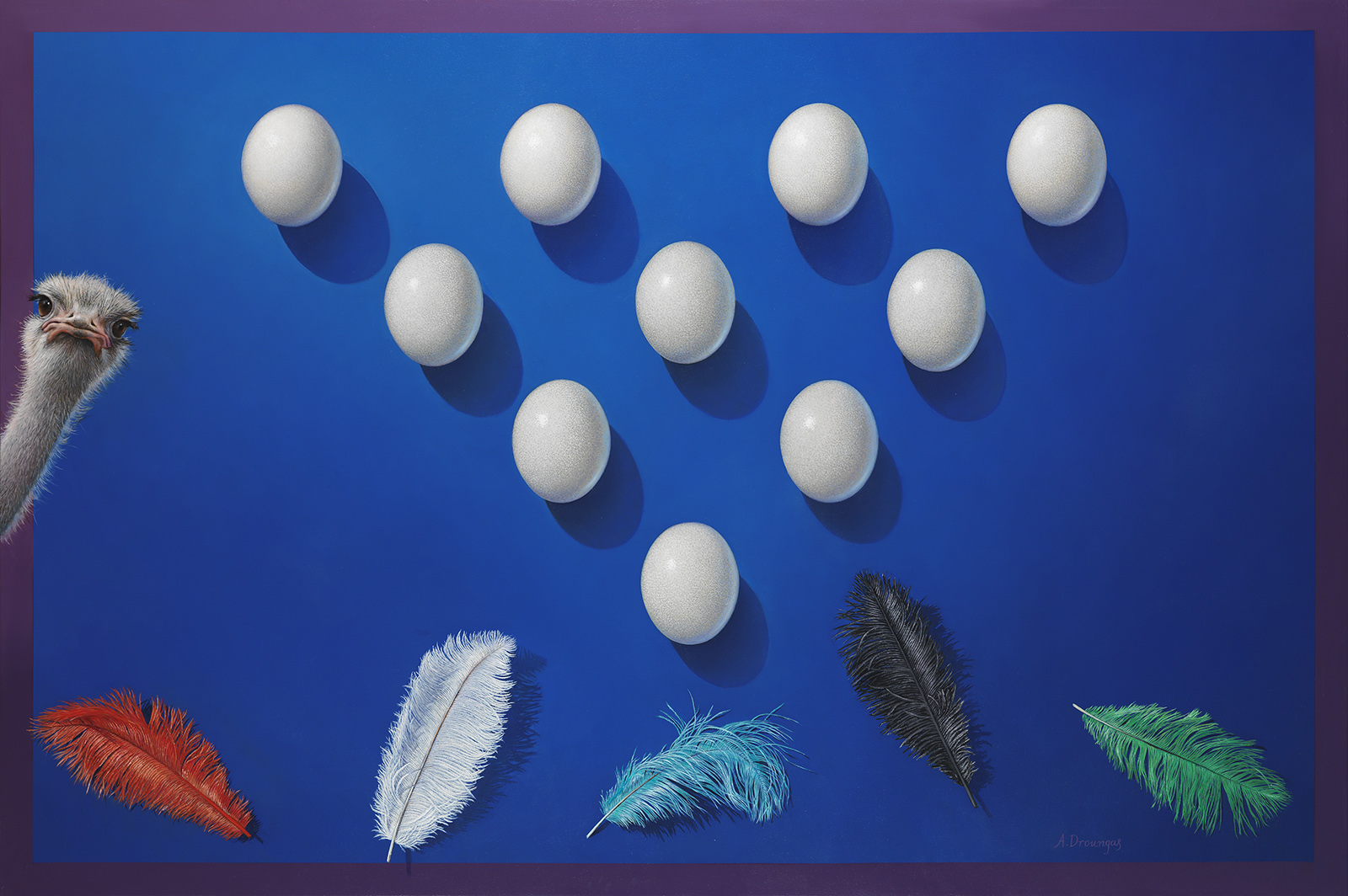 Η λεία, ακριβής, εντυπωσιακή ζωγραφική επιφάνεια γίνεται πύλη προς το στοχασμό. Κάθε πίνακας είναι μια προσεκτικά σκηνοθετημένη σύνθεση που μαγνητίζει το βλέμμα και στη συνέχεια ωθεί τον θεατή να αναρωτηθεί γιατί η μορφή έχει οργανωθεί με αυτόν τον τρόπο, τι ρόλο παίζουν τα αντικείμενα και ποια σχέση δημιουργείται μεταξύ του αντικειμένου και του συμβόλου.