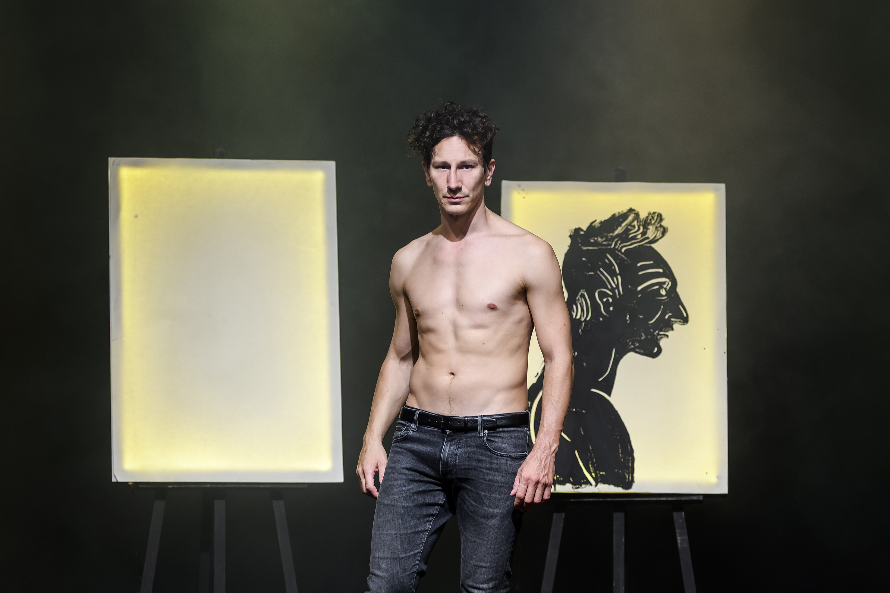 Ο Μιχάλης Σαράντης ερμηνεύει συγκλονιστικά και τους εννιά ρόλους της τραγωδίας, ενώ ο  Απόστολος Χαντζαράς συνομιλεί μαζί του ζωγραφίζοντας, μπροστά στα μάτια των θεατών.