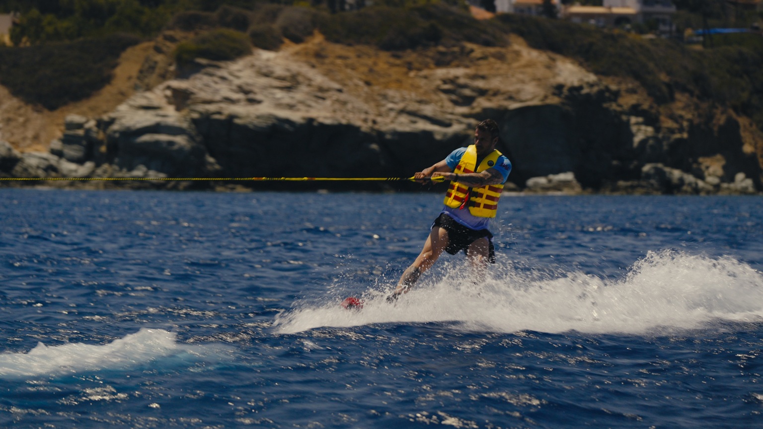 Συνεχίζοντας το οδοιπορικό του παραλιακά, επιδιώκει να δοκιμάσει τις αντοχές του στο wakeboard! Οδηγός του στα καταγάλανα νερά της Αγίας Πελαγίας γίνεται ο προπονητής θαλάσσιων σπορ, Γιάννης Σωμαράκης, ο οποίος του υπόσχεται από αδρεναλίνη μέχρι …σπιτικά μαγειρεμένα φασολάκια!