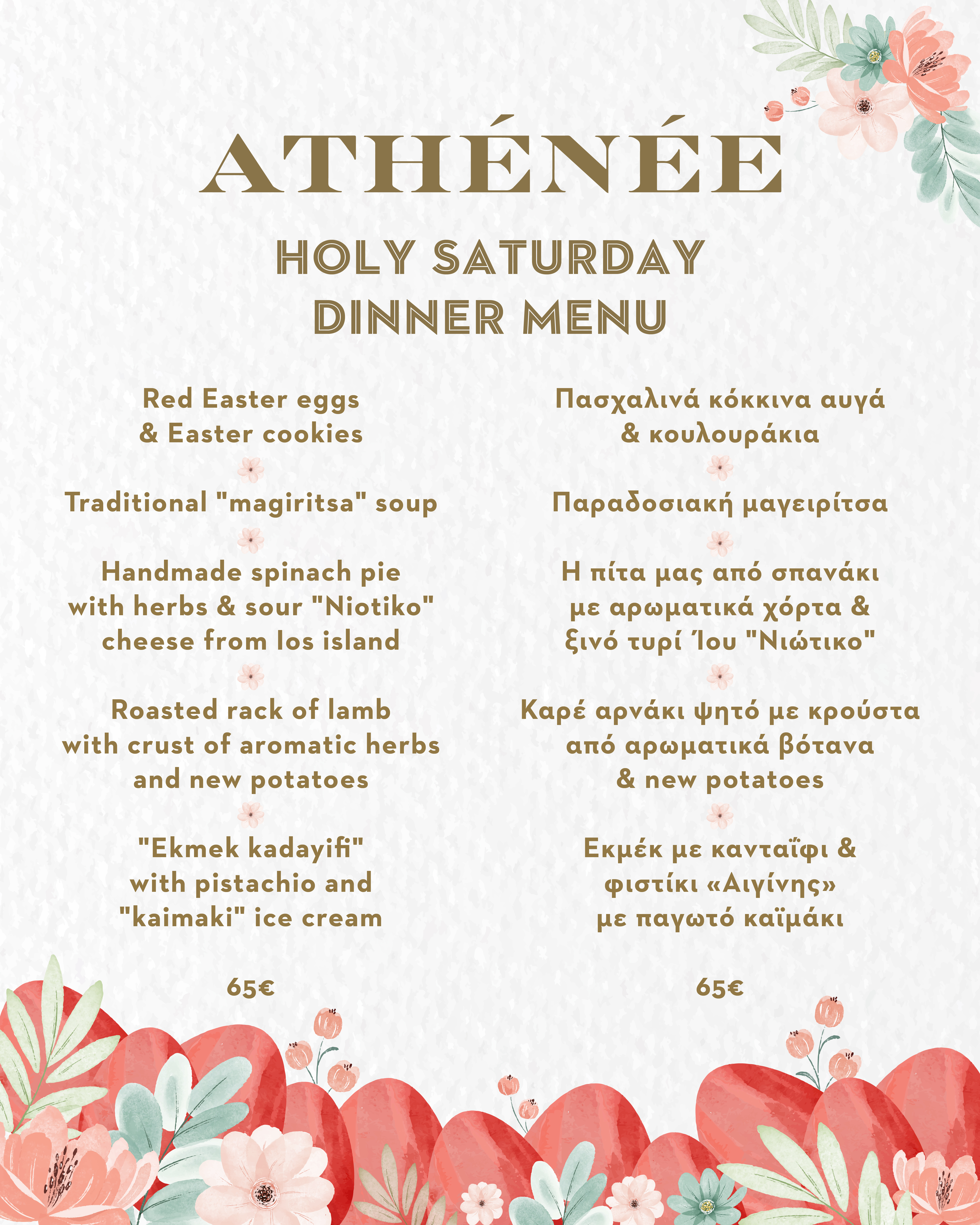 Το Athénée υποδέχεται τη βραδιά της Ανάστασης με ένα ειδικά διαμορφωμένο μενού, το Μεγάλο Σάββατο 19 Απριλίου από τις 19:00. Ο βραβευμένος chef Νίκος Σκλήρας, έχει δημιουργήσει ένα μενού βασισμένο σε πασχαλινές γεύσεις, το οποίο περιλαμβάνει παραδοσιακή μαγειρίτσα, καλομαγειρεμένο αρνάκι, λαχταριστά συνοδευτικά καθώς και κλασικά εδέσματα που επιβάλλει το πασχαλινό τραπέζι.