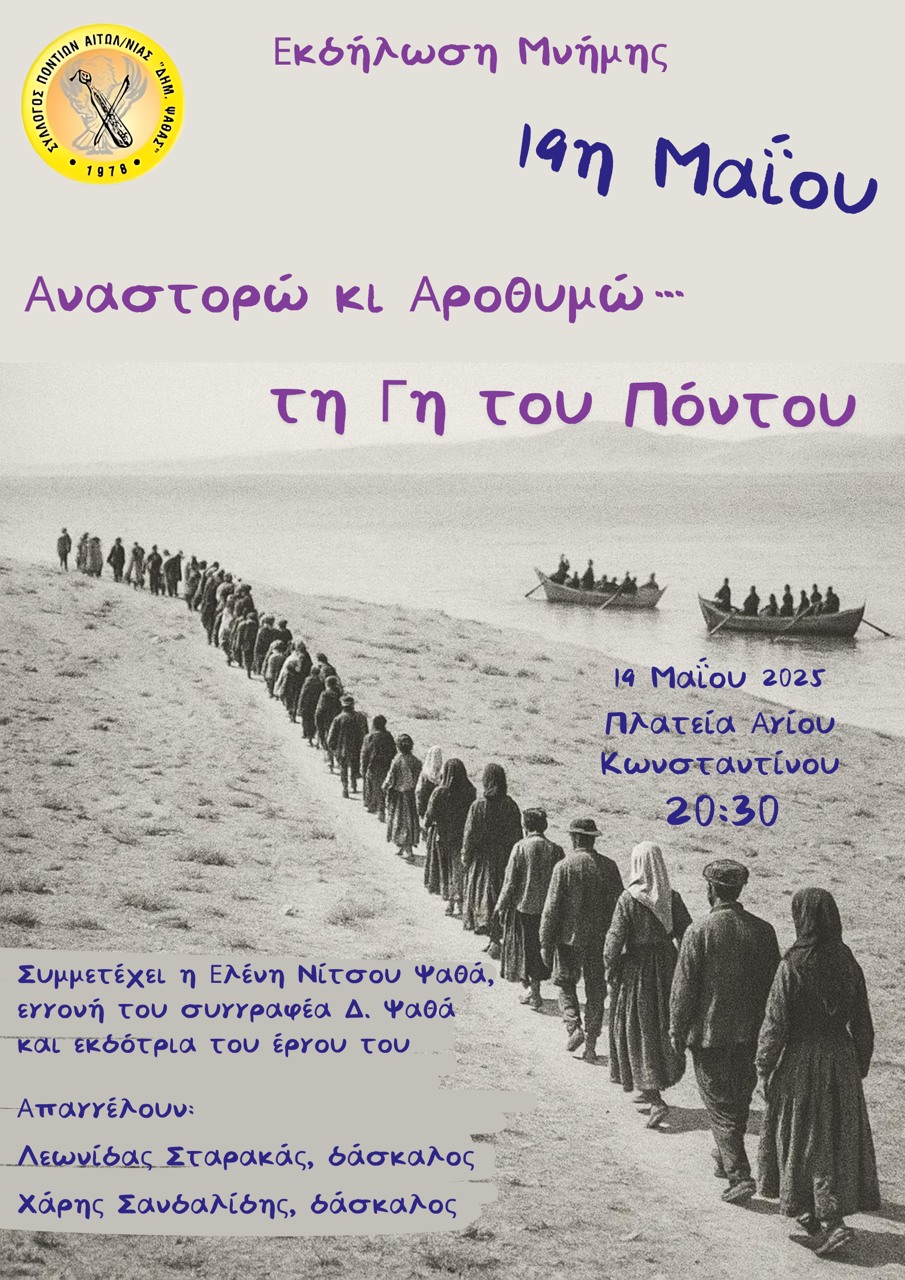 “Αναστορώ κι Αροθυμώ τη Γη του Πόντου”. Ο Σύλλογος Ποντίων Νομού Αιτωλοακαρνανίας «Δημήτρης Ψαθάς» τιμά την Ημέρα Μνήμης της Γενοκτονίας των Ελλήνων του Πόντου στις 19 Μαΐου, με μια εκδήλωση μνήμης, ιστορικής αναφοράς και πολιτιστικής συνέχειας. Η εκδήλωση θα πραγματοποιηθεί τη Δευτέρα 19 Μαΐου 2025 και ώρα 20:30, στην Πλατεία Αγίου Κωνσταντίνου στον Άγιο Κωνσταντίνο Αγρινίου.