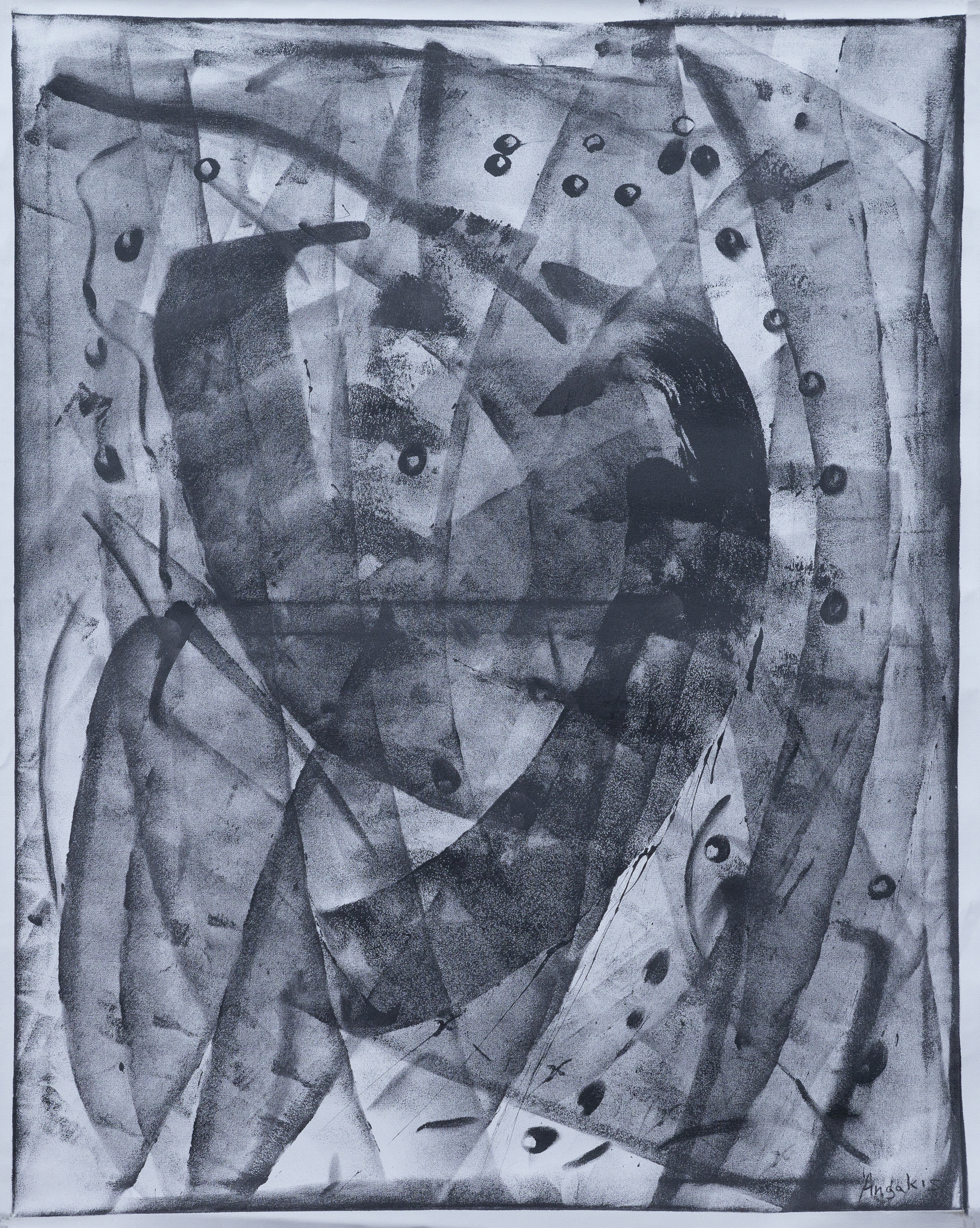 Στην καινούργια δουλειά μου γίνεται μια απόπειρα να συμπαρασύρουμε τον θεατή σε μια ψυχαναλυτική κατάδυση. Ο επισκέπτης θα δει μια σειρά από ασπρόμαυρες ζωγραφικές δημιουργίες, που επιχειρούν να ανατρέψουν όλους τις συμβατικούς κώδικες της εικαστικής τέχνης και τελικά  επιχειρούν να εξευμενίσουν, μέσα από την τεχνική της αφαίρεσης, την κοινωνική σύγχυση της εποχής που καθημερινά γίνεται όλο και εντονότερη.