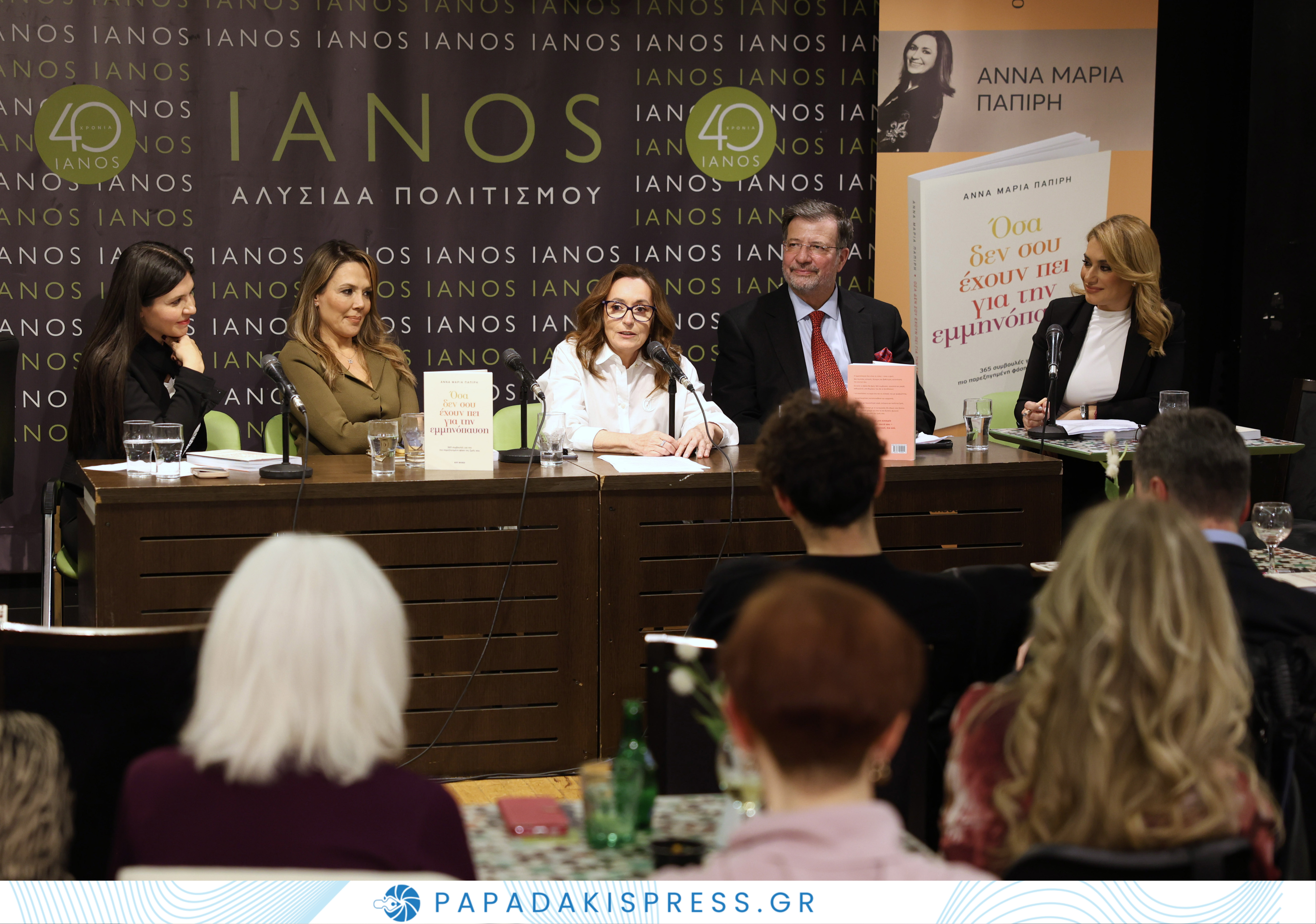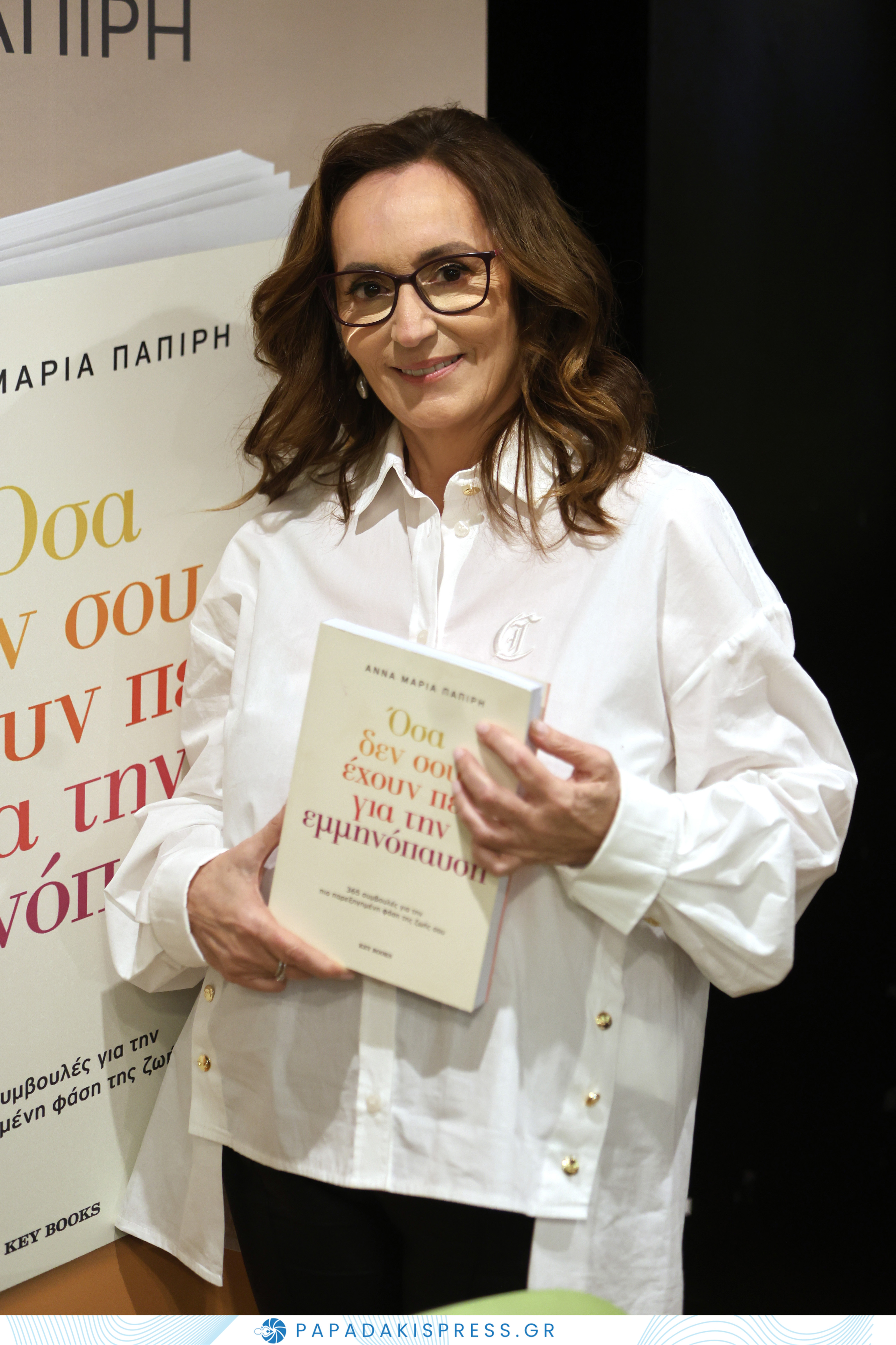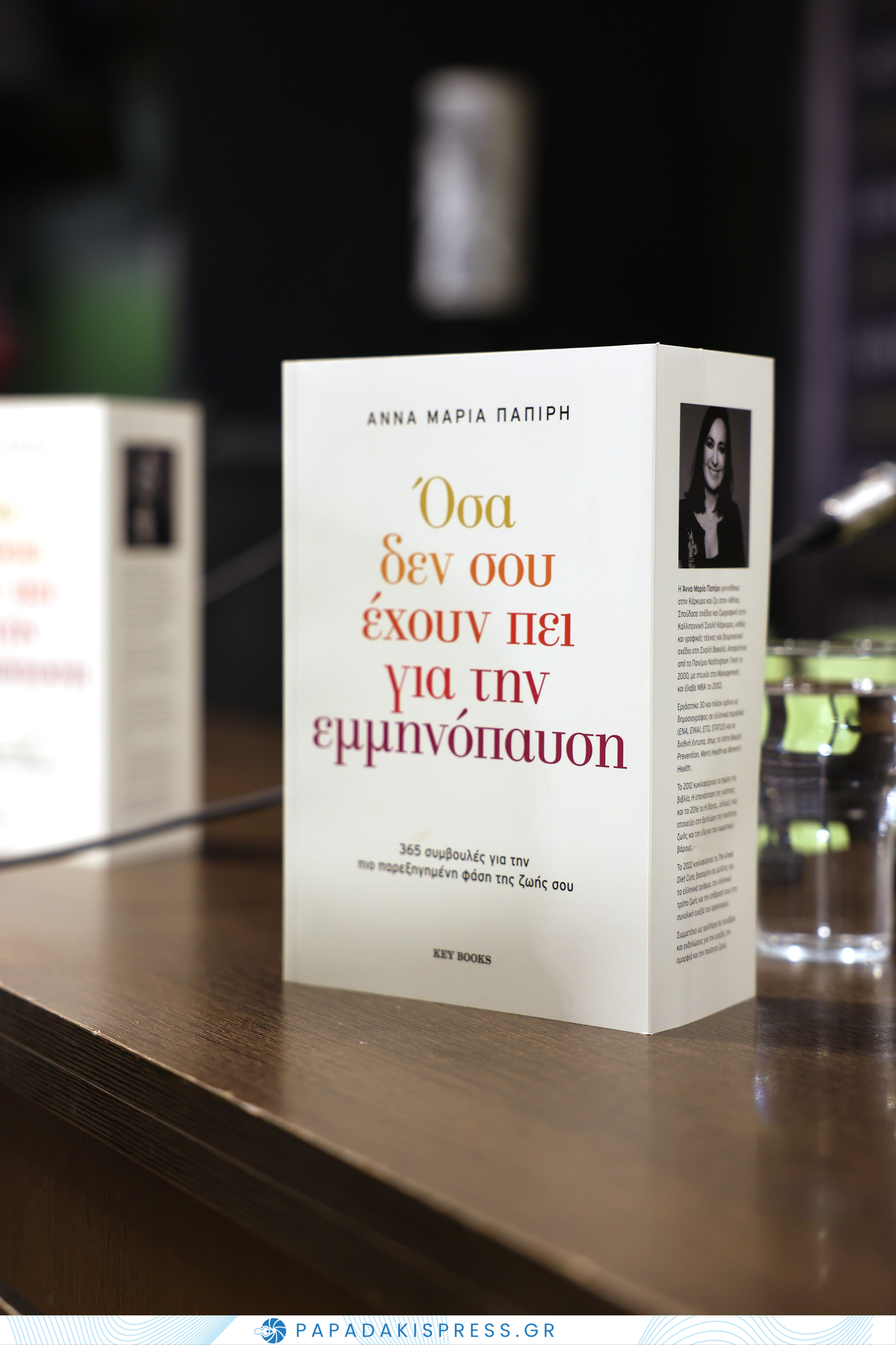 Στην κατάμεστη αίθουσα του Βιβλιοπωλείου ΙΑΝΟΣ, σε μια εξαιρετικά ζεστή ατμόσφαιρα, πραγματοποιήθηκε η παρουσίαση του νέου βιβλίου της Άννας Μαρία Παπίρη με τίτλο «Όσα δεν σου έχουν πει για την εμμηνόπαυση» εκδ. Key Books. Με μεγάλη συμμετοχή από την ευρύτερη επιχειρηματική αγορά του χώρου της ευεξίας, δημοσιογράφων, εκπροσώπων θεσμικών φορέων, των επιστημονικών συνεργατών του βιβλίου και φίλων της γνωστής συγγραφέως, η εκδήλωση αποτέλεσε αφορμή ενημέρωσης για τις επιπτώσεις της εμμηνόπαυσης στην υγεία και την ποιότητα ζωής των γυναικών.