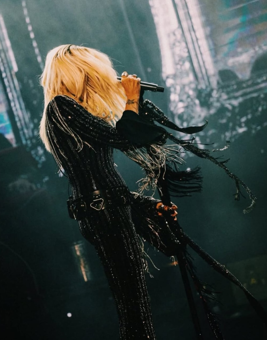 Τα ασημένια κρυστάλλινα κρόσσια που περιβάλλουν τη σιλουέτα της δημιουργούν εκρηκτικά rock-glam waves σε κάθε κίνηση—ένα θέαμα που επιβεβαιώνει πως η πρεμιέρα δεν ήταν απλώς εμφάνιση, αλλά στιγμή. Μια στιγμή αντάξια της μοναδικής της αύρας. Styling: Σοφία Καρβέλα