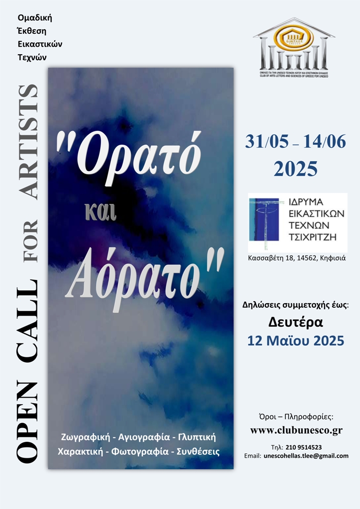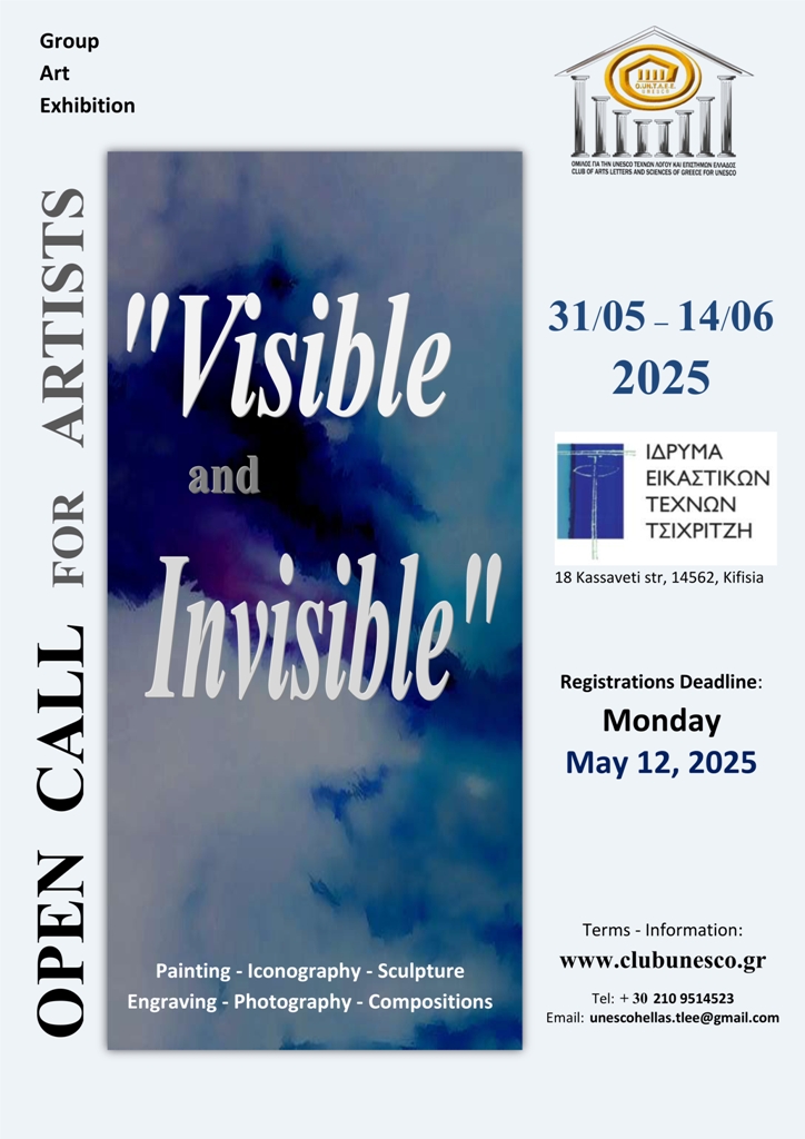 Ο Όμιλος για την UNESCO Τεχνών, Λόγου και Επιστημών Ελλάδος ανοίγει τον εικαστικό του κύκλο για το έτος 2025, με τη διοργάνωση διεθνούς, ομαδικής έκθεσης εικαστικών τεχνών με τίτλο: «Ορατό και Αόρατο – Visible and Invisible», η οποία θα πραγματοποιηθεί από 31 Μαΐου έως 14 Ιουνίου 2025, στο Ίδρυμα Εικαστικών Τεχνών Τσιχριτζή (Κασσαβέτη 18 14562 Κηφισιά).