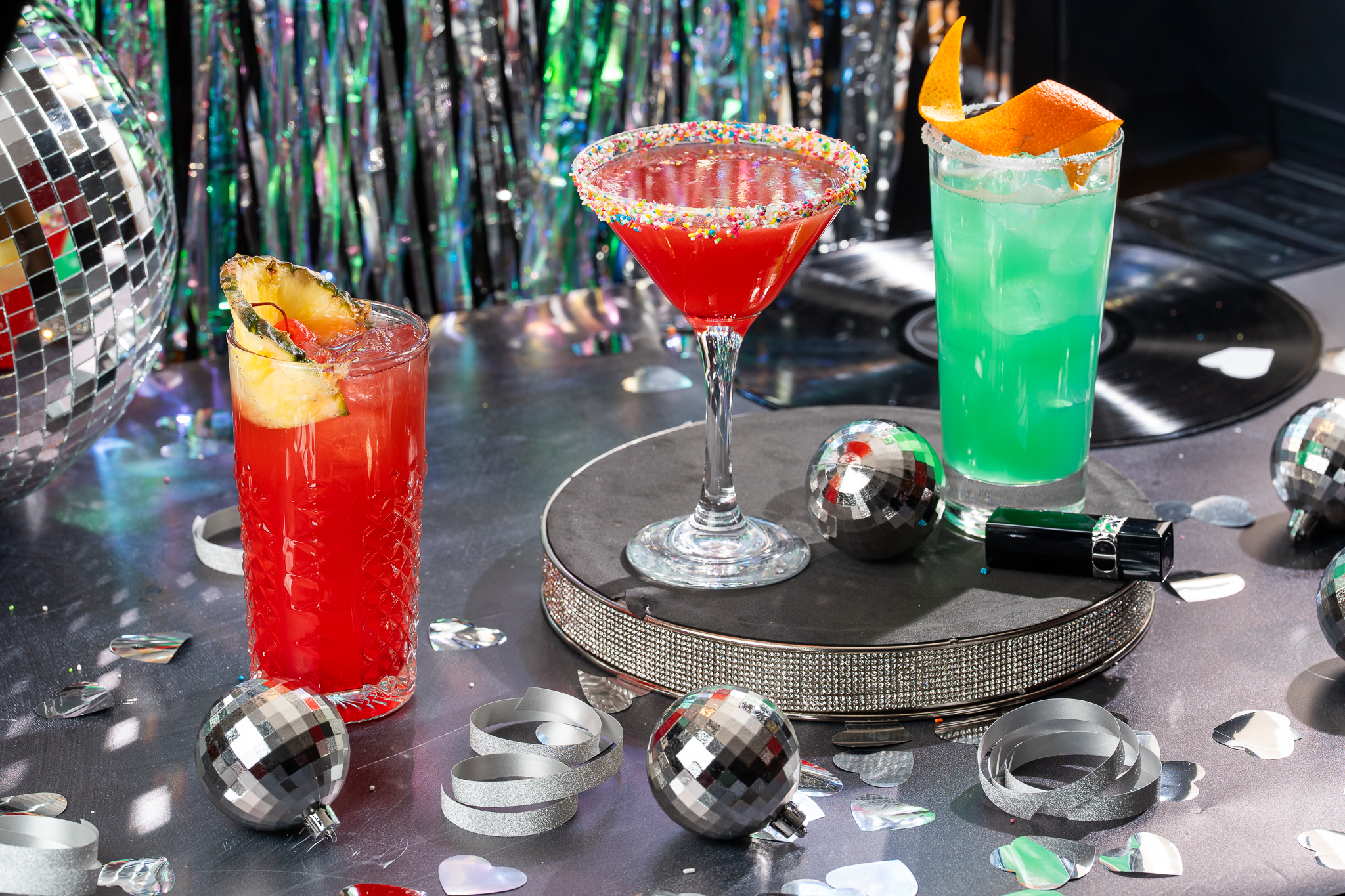 Κεντρικό ρόλο στο Friday Night Fever παίζουν τρία ολοκαίνουργια cocktails, εμπνευσμένα από το ρυθμό και τη λάμψη της εποχής. Η Caborita έρχεται να δώσει ένα φρέσκο twist στη margarita, συνδυάζοντας el Jimador Blanco με margarita mix, Blue Curaçao και χυμό πορτοκαλιού, δημιουργώντας μια έντονη και άκρως απολαυστική γεύση. Η Disco Diva, εκρηκτική και εντυπωσιακή όπως υποδηλώνει το όνομά της, παντρεύει το Havana Cuban Spiced με χυμό λεμονιού, σπιτικό σιρόπι ginger και spicy jalapeño, ενώ ολοκληρώνεται με cotton candy για μια παιχνιδιάρικη και ανατρεπτική παρουσία. Το τρίτο cocktail της εμπειρίας, το διαχρονικό Singapore Sling, συνδυάζει Beefeater London Dry Gin, Orange Curaçao, ανανά και φρέσκο χυμό λεμονιού, προσφέροντας μια δροσερή, τροπική νότα.