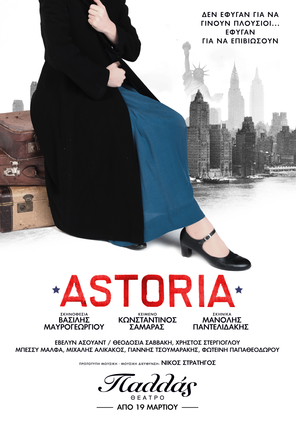 Από τις 19 Μαρτίου,στο Θέατρο Παλλάς, η «ASTORIA»αφήγείται επί σκηνής και με ζωντανή ορχήστρα υπό τη μουσική διεύθυνση του Νίκου Στρατηγού, τον πόνο της ξενιτιάς με αλήθεια και συγκίνηση.