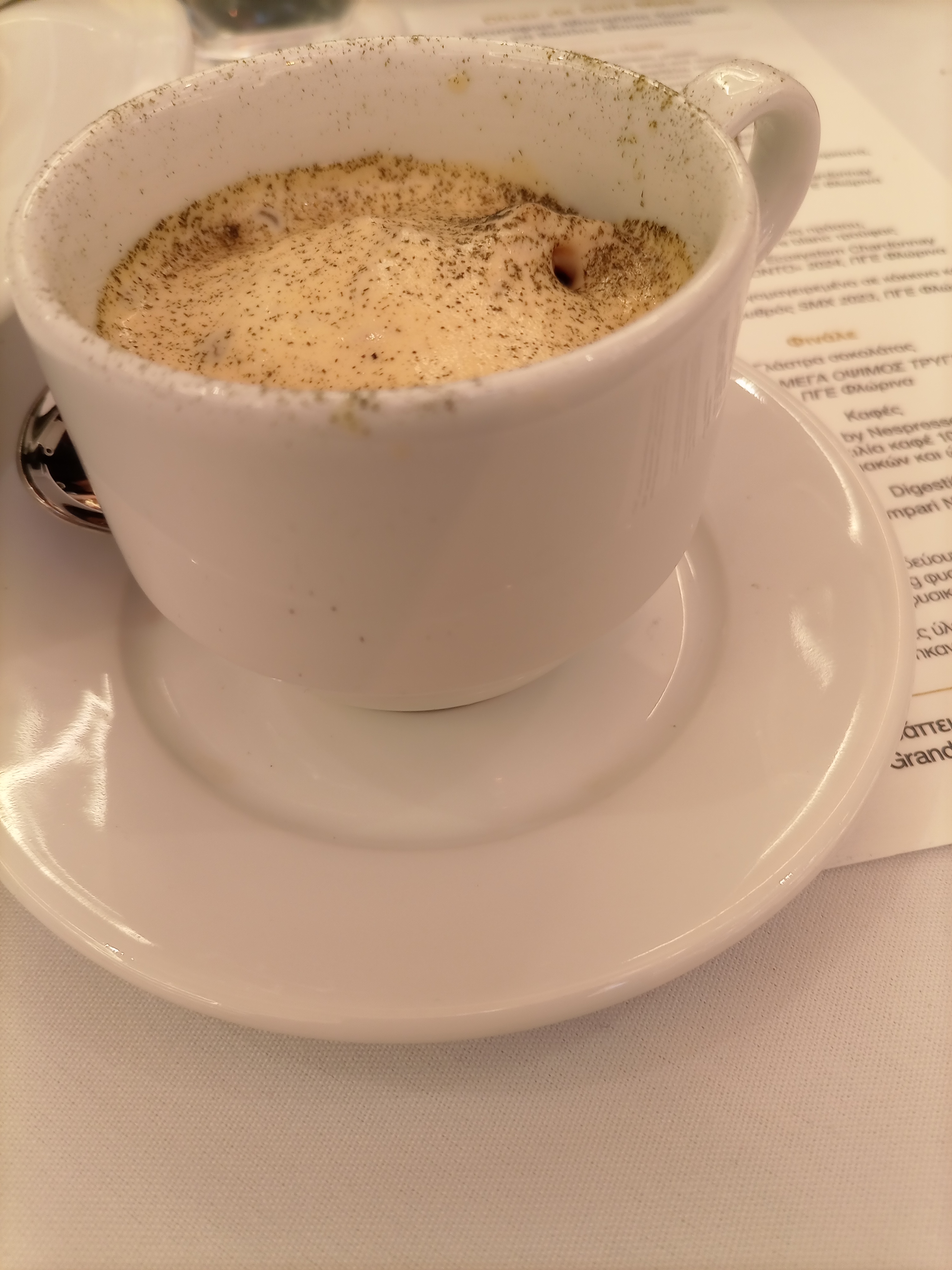 Cappuccino, κρέμα αβγολέμονο, χόρτα τσιγαριαστά, καπνιστό χέλι