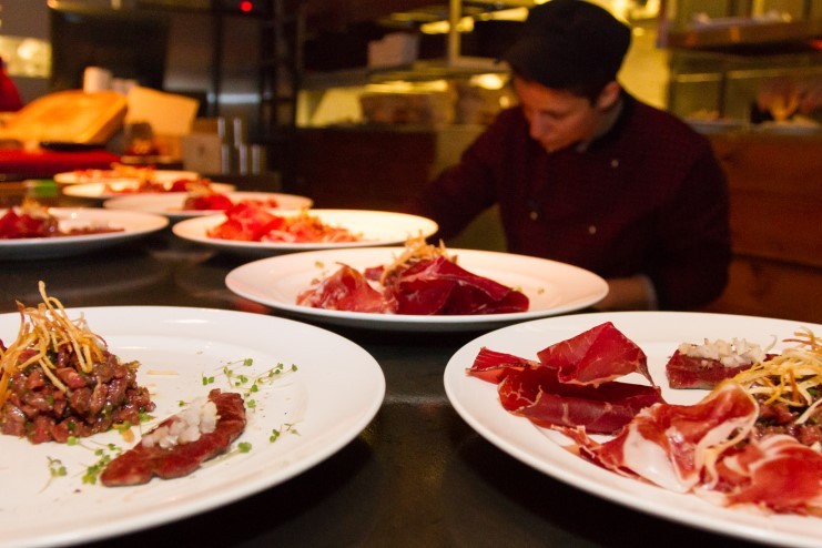 Δεν ήταν όμως μόνο η παρέα. Η ατμόσφαιρα ζεστάθηκε με το «καλησπέρα σας». Τα υπέροχα Allones Extra Edicion Limitada 2011 φρόντισαν για αυτό, συνεπικουρούμενα από το γλυκόπιοτο και φρουτώδες Hennessy Fine & tonic. Στην συνέχεια, ο Άρης Βεζενές έδωσε τον καλύτερο εαυτό του και εντυπωσίασε τους πάντες με μια διαδοχή απίθανων γεύσεων που συνόδευσαν στην εντέλεια τα ερυθρά κρασιά από το Κτήμα Άλφα. Το κομψό Pinot Noir ανέδειξε μια επιλογή από αλλαντικά Extremadura, το απίθανο ταρτάρ από wagyu και το συγκλονιστικό σασίμι βοδινού με τριμένο φουαγκρά. Το πλούσιο και βελούδινο Κτήμα Άλφα στάθηκε άψογα δίπλα στην γευστική βόμβα που αποτελούν τα υπέροχα νιόκι με ραγού από ελληνικό, μαυροπόδαρο χοίρο, με τσορίζο και τυρί Valcassoto από το Πιεμόντε. Τέλος, το πληθωρικό και σύνθετο Tannat βρήκε τέλειο ταίρι στα βοδινά steaks σε μια ποικιλία από κοπές και προελεύσεις… ειδικά στο εκπληκτικό short rib από χιλιάνικο wagyu!