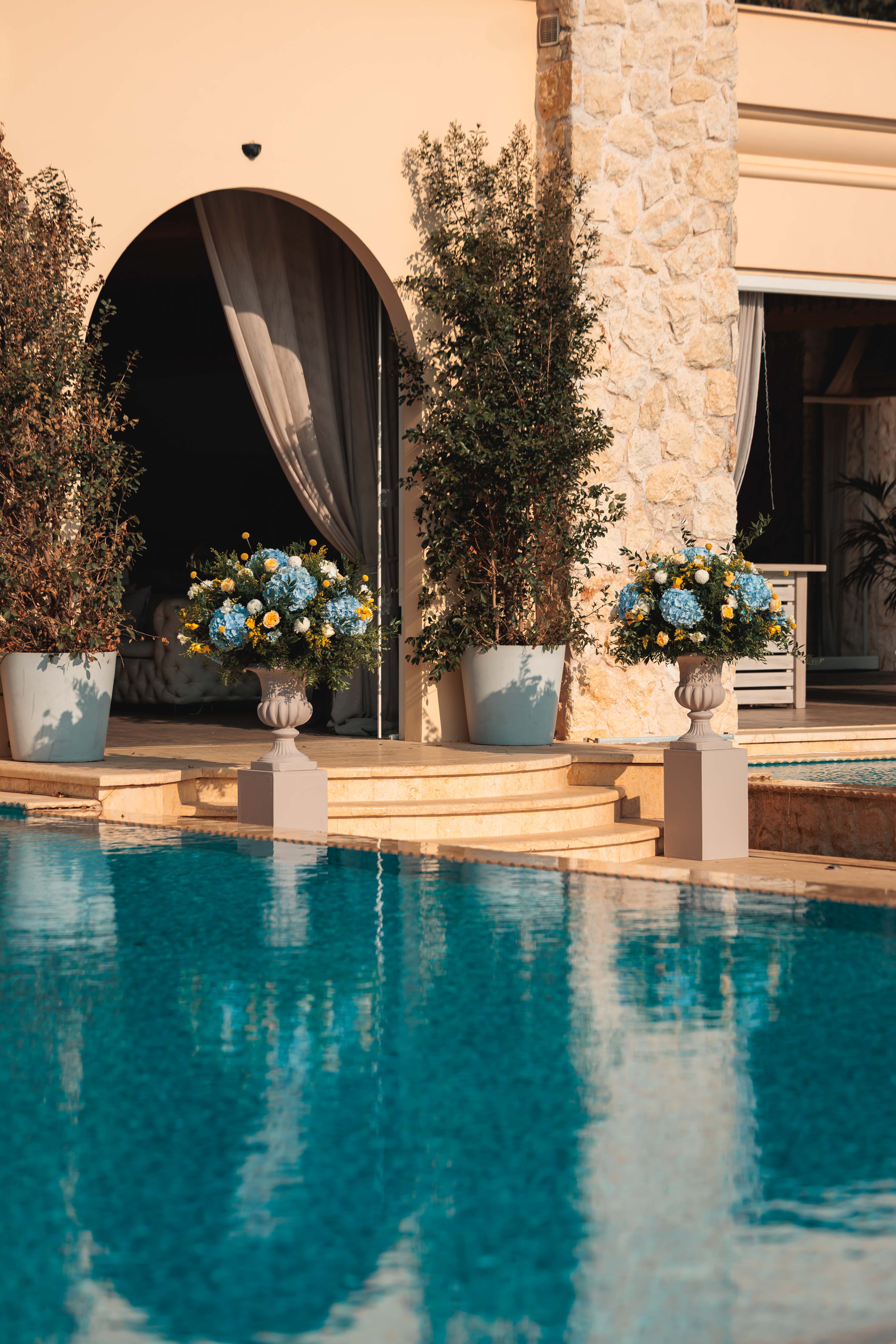 Στο Κτήμα Ορίζοντες οι φοίνικες και οι 2 μεγάλες πισίνες εντυπωσιάζουν τους καλεσμένους.