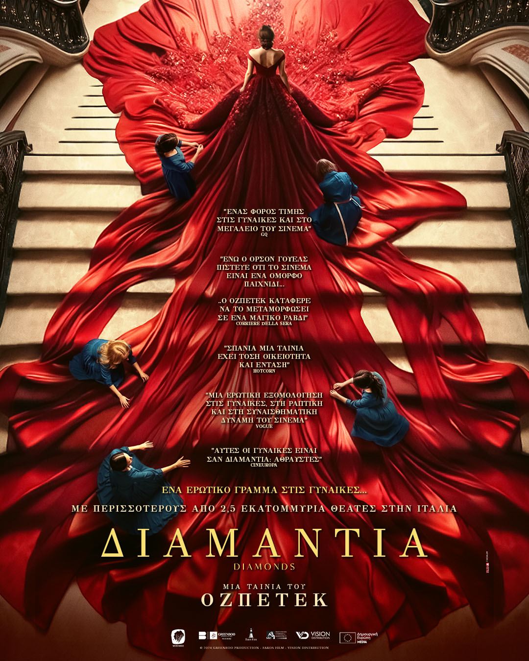 Μία ταινία-ερωτική επιστολή στις γυναίκες, μία ωδή στη μαγεία του σινεμά και τη δύναμη των γυναικών, στην οποία πρωταγωνιστούν 18 κορυφαίες Ιταλίδες ηθοποιοί. ‘Ενα κινηματογραφικό «διαμαντάκι» που έκοψε πάνω από 2,5 εκατομμύρια εισιτήρια στην Ιταλία. H Weirdwave, από τις 14 Αυγούστου, παρουσιάζει στους κινηματογράφους την ιταλική ταινία Διαμάντια του Φερζάν Όζπετεκ. Μέσα από τα μάτια ενός σκηνοθέτη που ετοιμάζει την πιο προσωπική του ταινία, το φιλμ μας ταξιδεύει σε ένα ιστορικό ραφείο κοστουμιών στη Ρώμη. Εκεί, γυναίκες κάθε ηλικίας ράβουν τα όνειρα του ιταλικού σινεμά. Στο επίκεντρο, δύο αδελφές που κρατούν ζωντανή μια παράδοση γεμάτη πάθος και μυστικά.