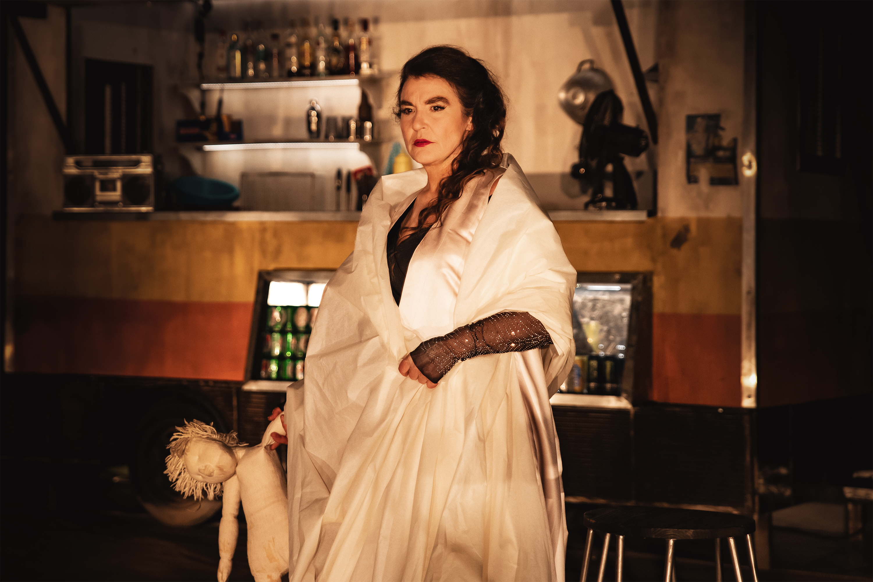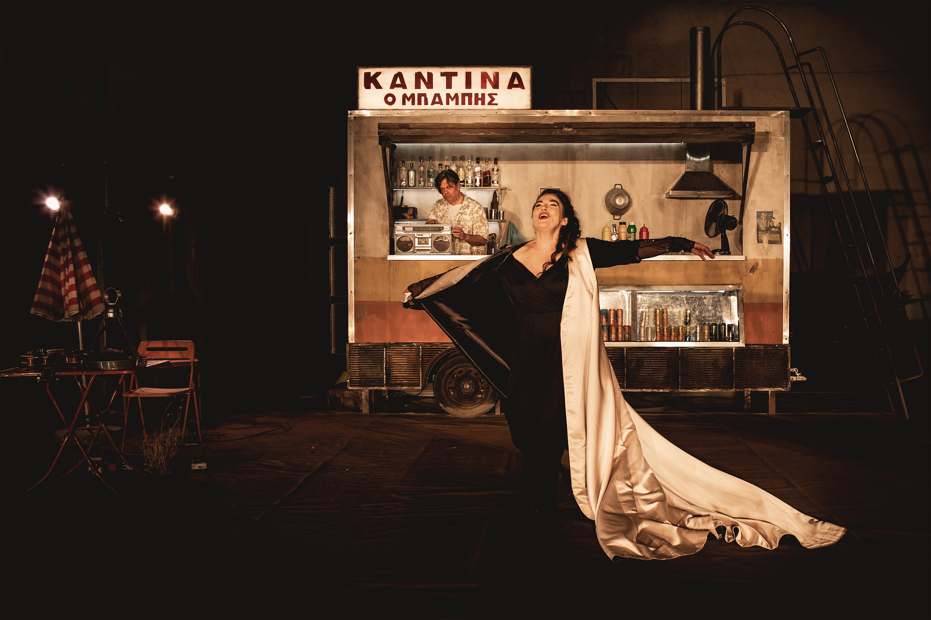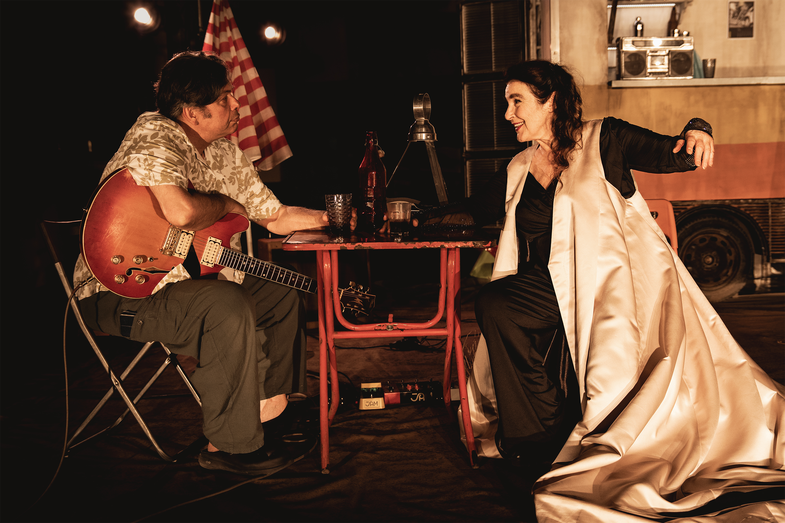 Μαζί της στη σκηνή, ο Μπάμπης Παπαδόπουλος, ο θρυλικός κιθαρίστας του σπουδαιότερου ελληνικού ροκ συγκροτήματος Τρύπες, ερμηνεύει ζωντανά τη μουσική που συνθέτει για την παράσταση.