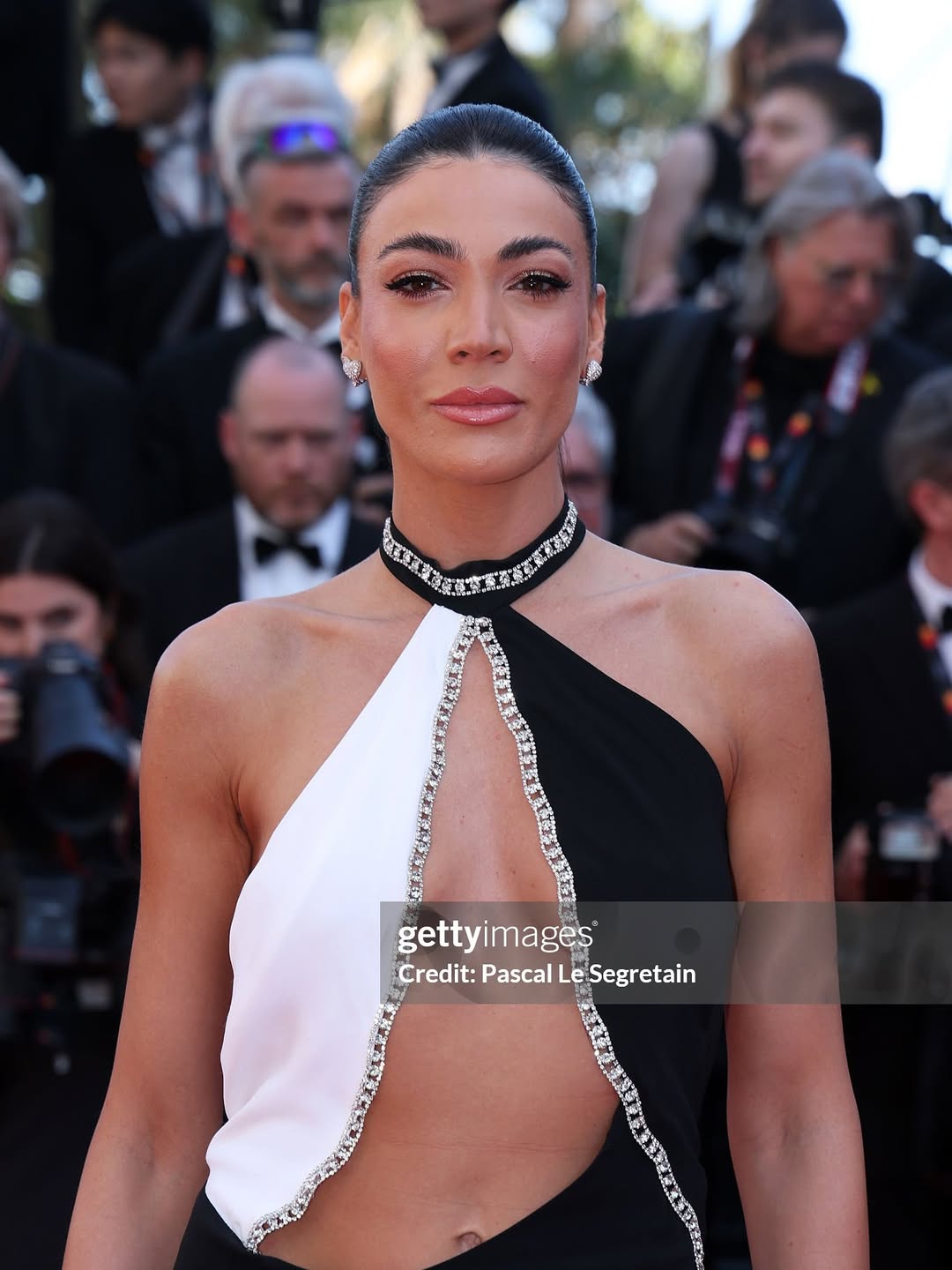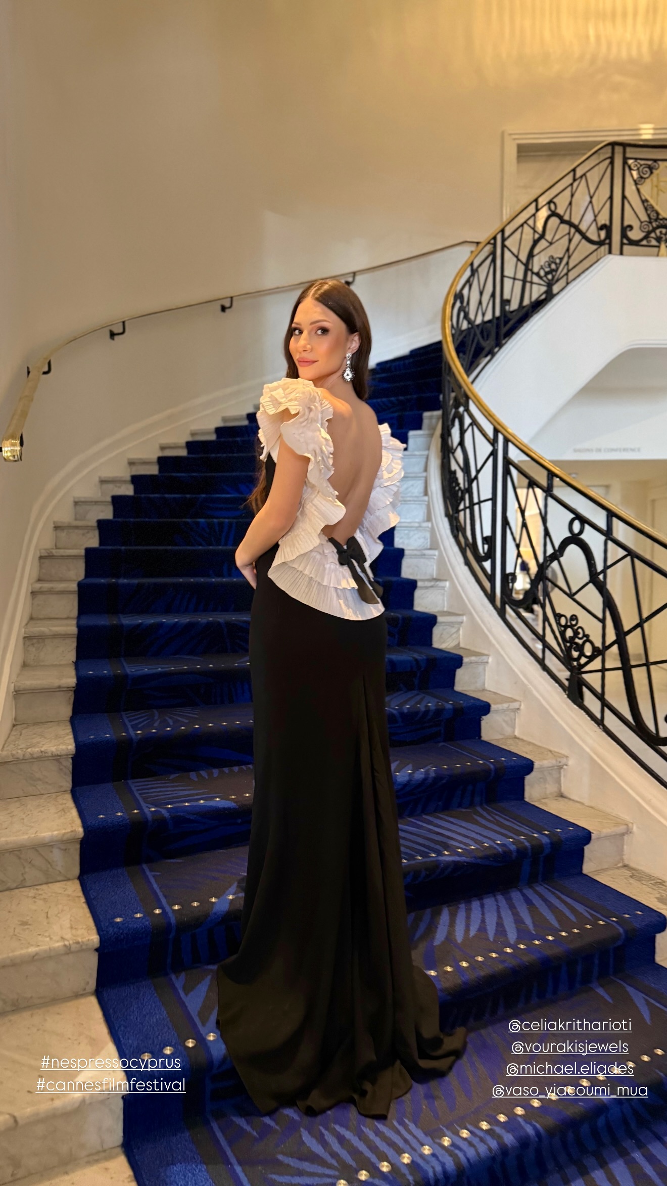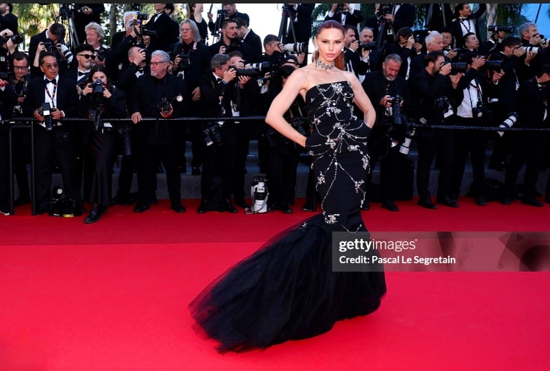 Η Έβελυν Καζαντζόγλου μαγνήτισε τα βλέμματα με μία ακόμη δημιουργία από τη συλλογή του Παρισιού: ένα «γοργονέ» μαύρο φόρεμα, περίτεχνα κεντημένο με κρύσταλλα Swarovski, που ολοκληρωνόταν με ουρά από τούλι. Ένα glamorous look με θεατρικότητα, λάμψη και απαράμιλλο στυλ, το οποίο είχε χολυγουντιανό αέρα.