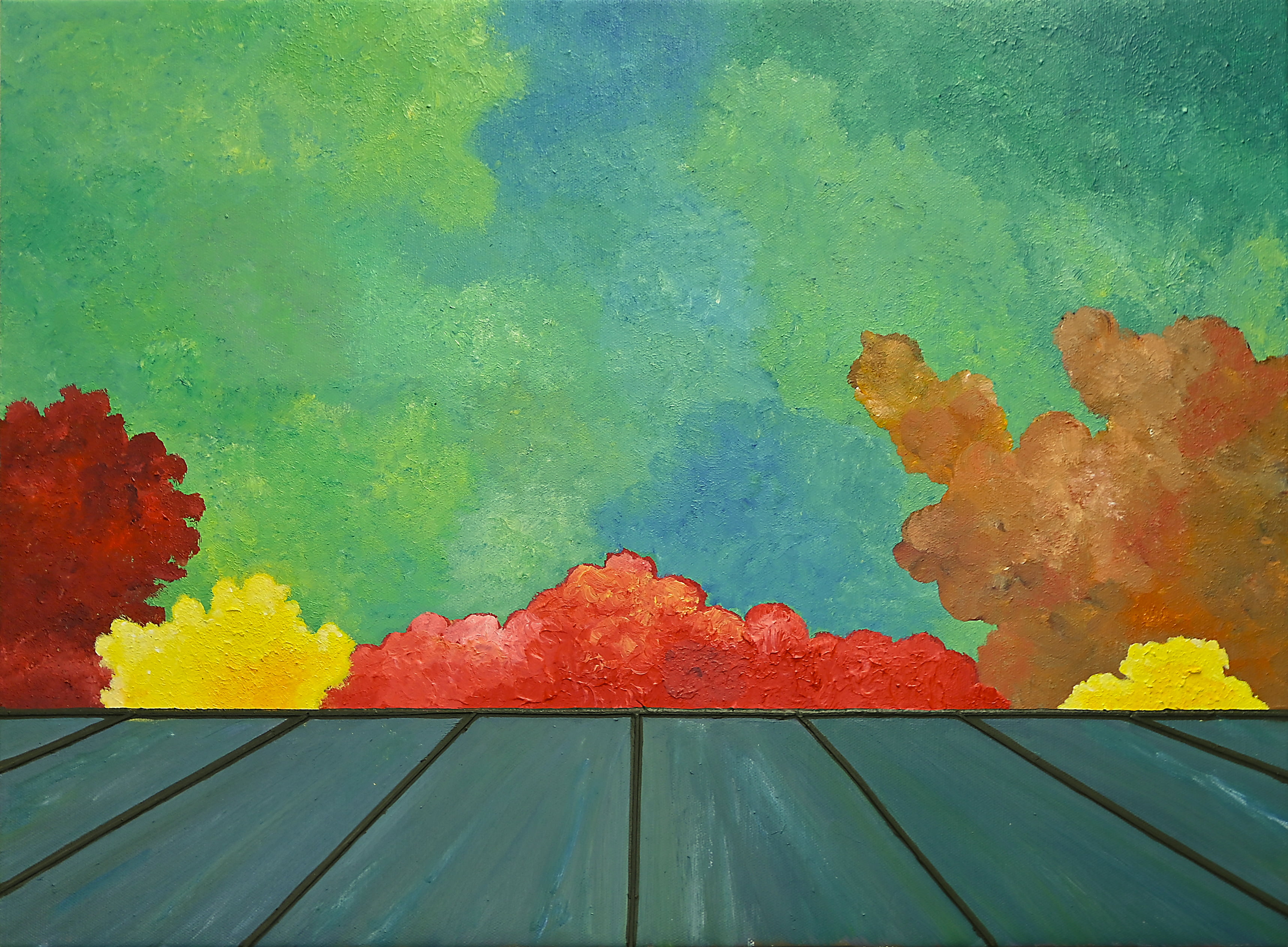 Πρόκειται για τοπία της πόλης με έντονα πλακάτα χρώματα, σε εντυπωσιακούς συνδυασμούς, που προσφέρουν αισθήματα αισιοδοξίας, ευφορίας και ελπίδας. Ο αρχιτεκτονικός χαρακτήρας και η γραμμική προοπτική, δίνουν την αίσθηση του βάθους και της έκτασης του χώρου, με τρόπο ομοιόμορφο και γεωμετρικό.