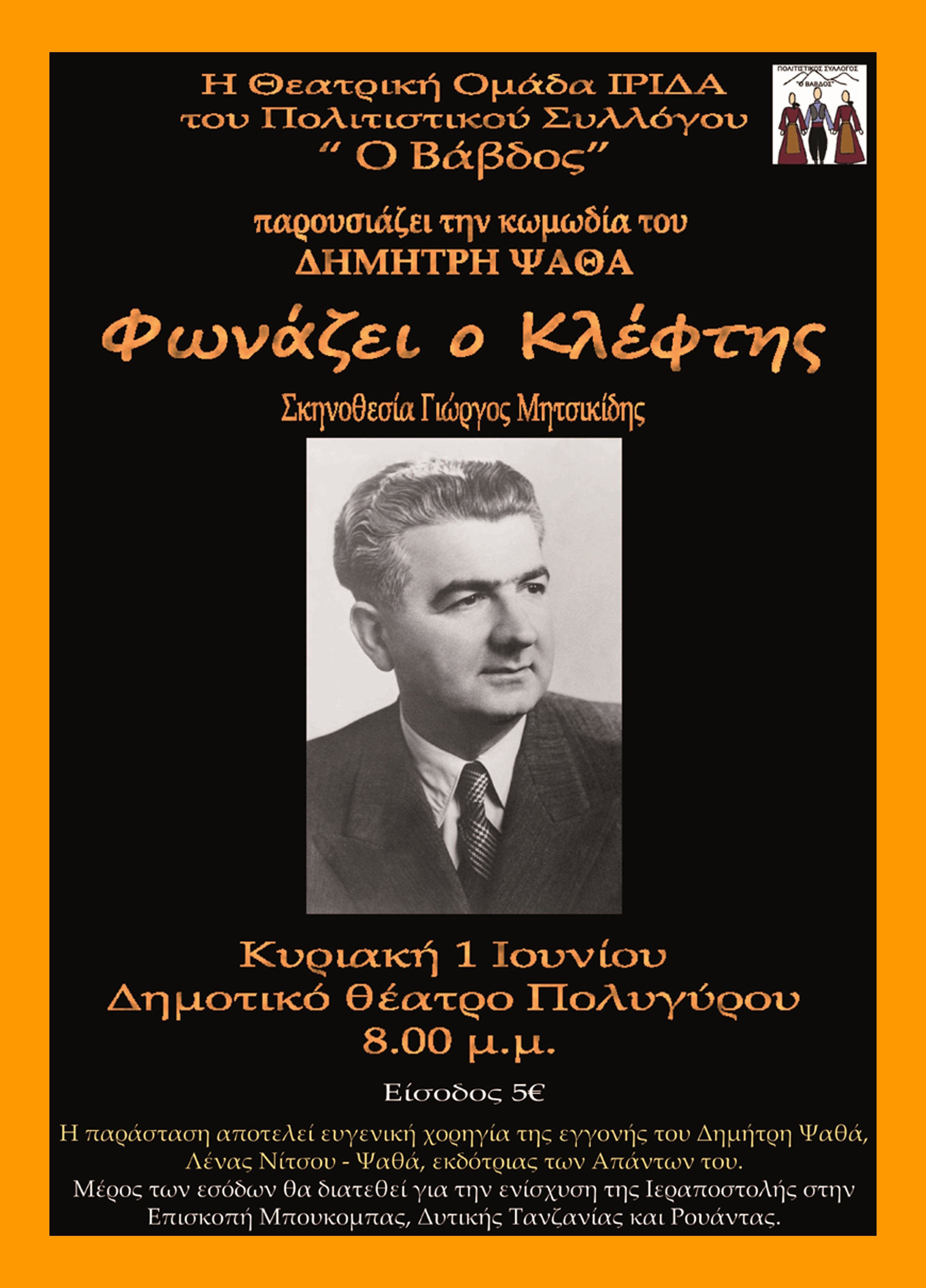 Τη διαχρονική κωμωδία του Τραπεζούντιου συγγραφέα Δημήτρη Ψαθά «Φωνάζει ο κλέφτης» σε σκηνοθεσία Γιώργου Μητσικίδη παρουσιάζει στο Δημοτικό Θέατρο Πολυγύρου Χαλκιδικής την Κυριακή 1 Ιουνίου στις 8 το βράδυ η Θεατρική Ομάδα «Ίριδα» του Πολιτιστικού Συλλόγου “Ο Βάβδος”.