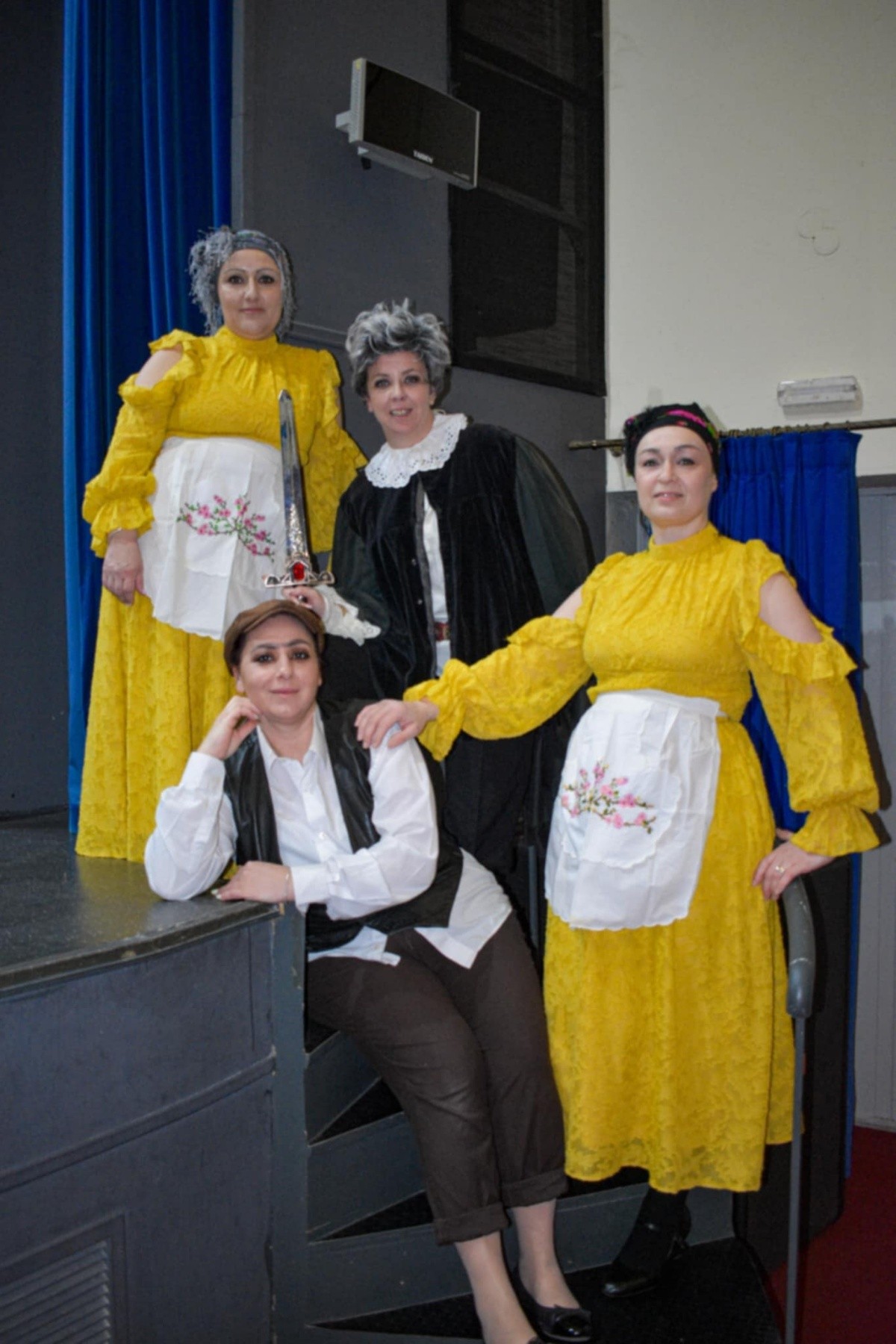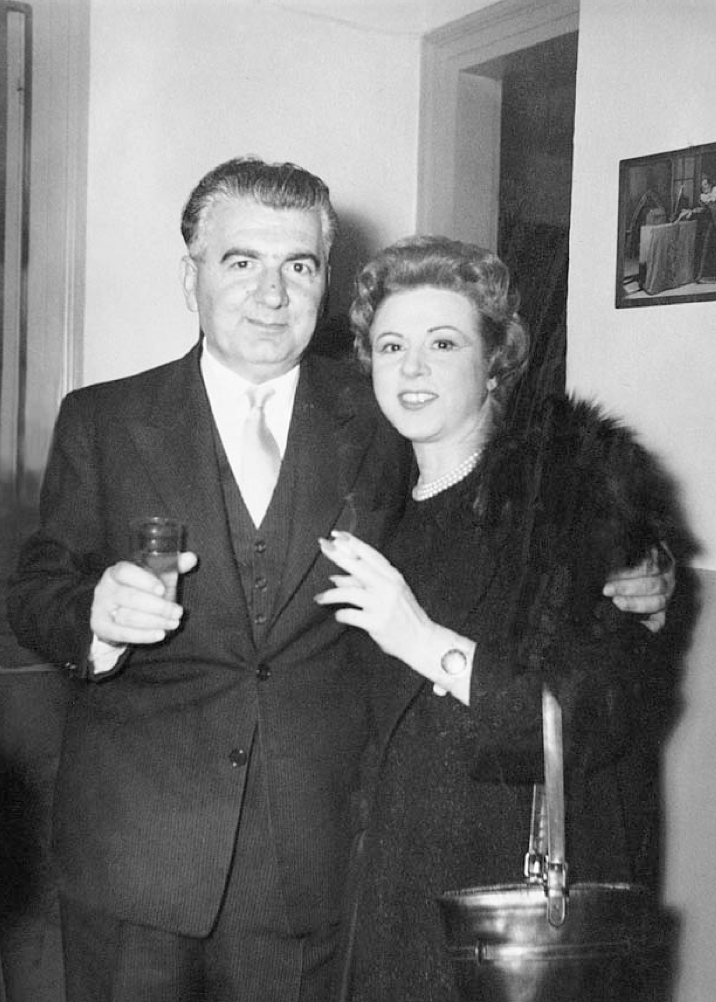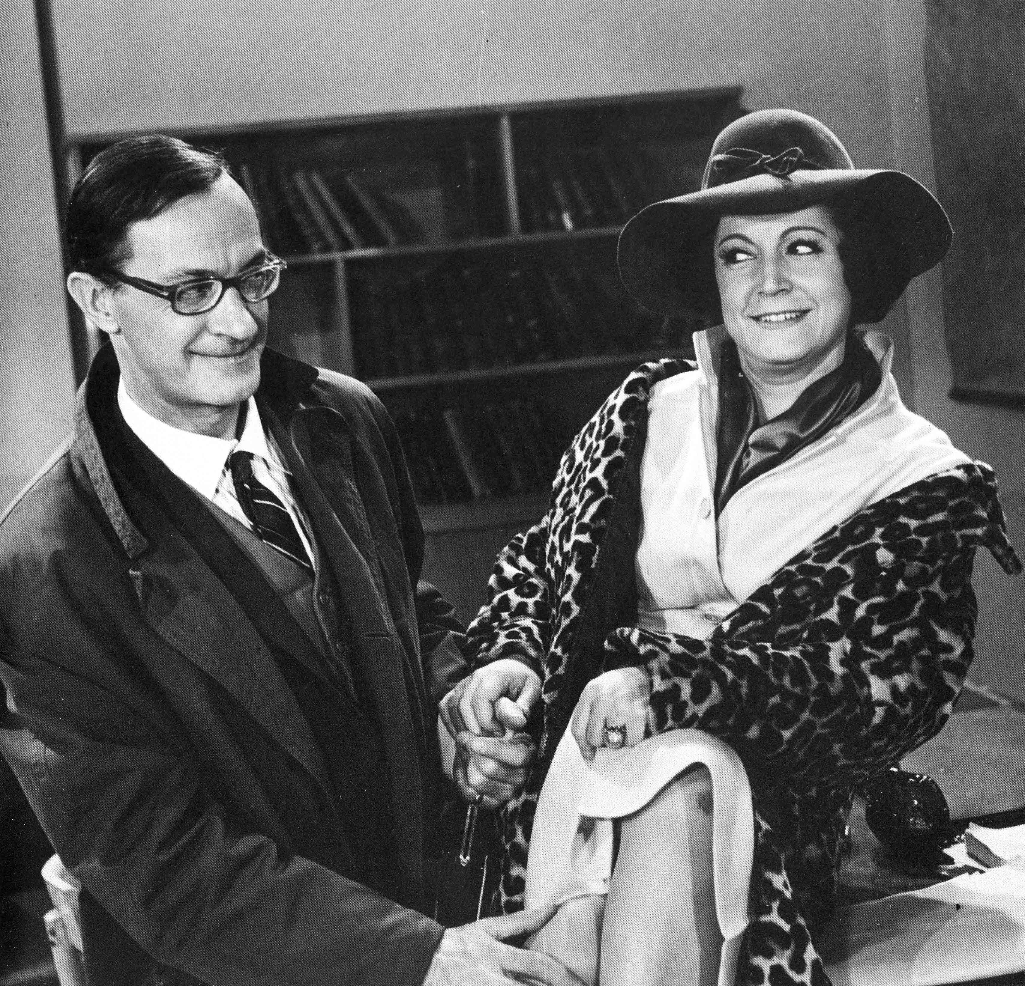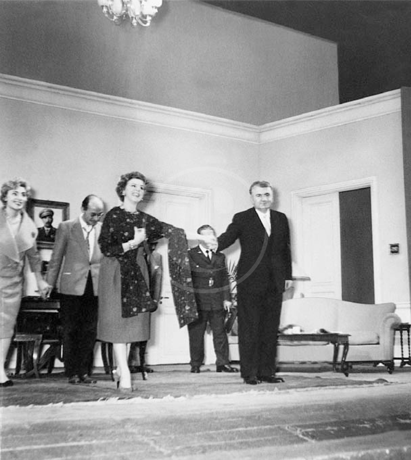 Η πρωταγωνίστρια Μαίρη Αρώνη και ο Δημήτρης Ψαθάς υποκλίνονται μαζί με όλον τον υπόλοιπο θίασο στην 100η πανηγυρική παράσταση στις 5 Δεκεμβρίου 1958. Πίσω της διακρίνεται ο συμπρωταγωνιστής της Ντίνος Ηλιόπουλος ενώ στο κάδρο του σκηνικού διακρίνεται ο στρατηγός Σόλων Καρακλέων ρόλο που ερμήνευσε πάνω στη σκηνή με ιδιαίτερη μαεστρία ο Διονύσης Παπαγιαννόπουλος (φωτ. αρχείο Λένας Νίτσου-Ψαθά)