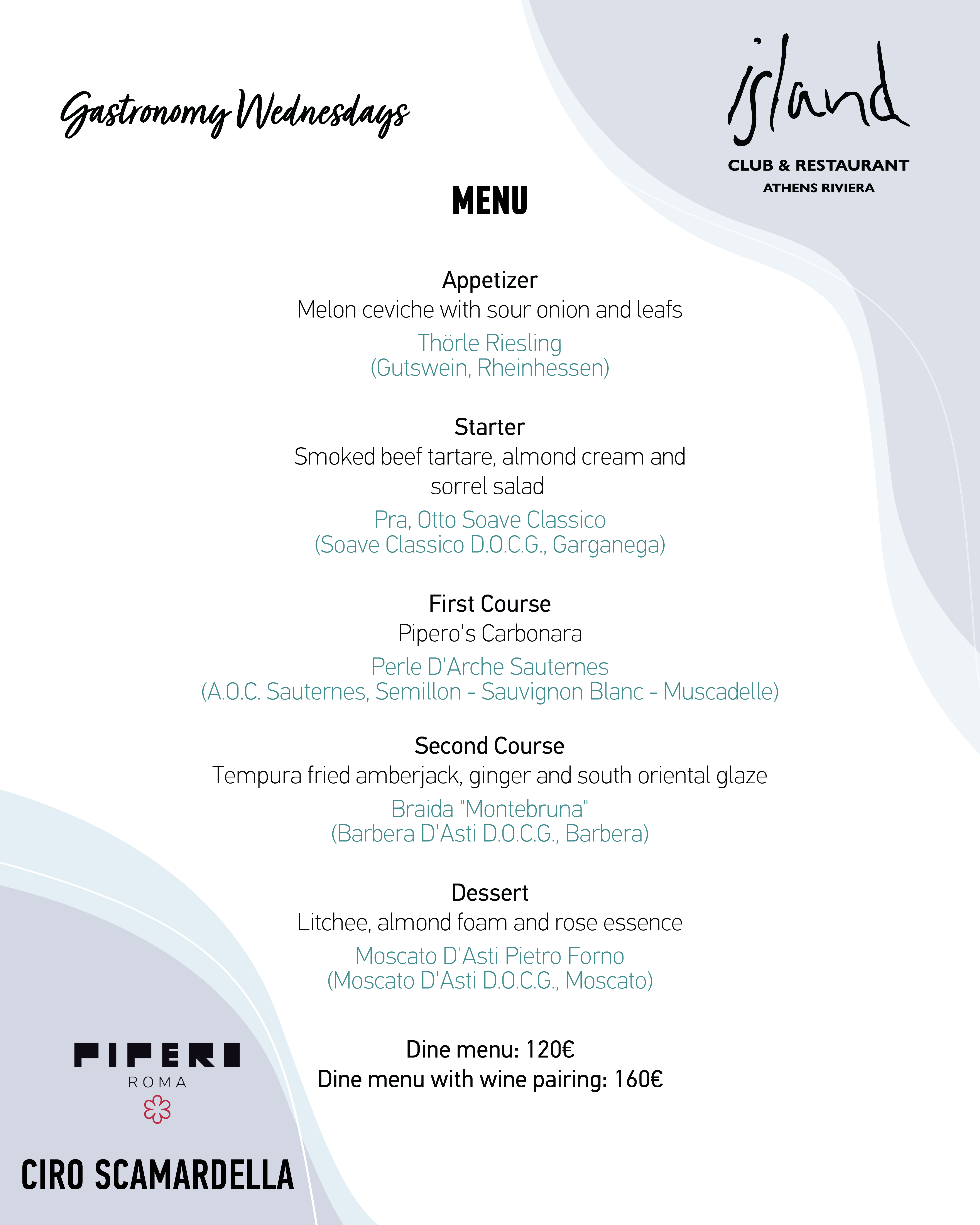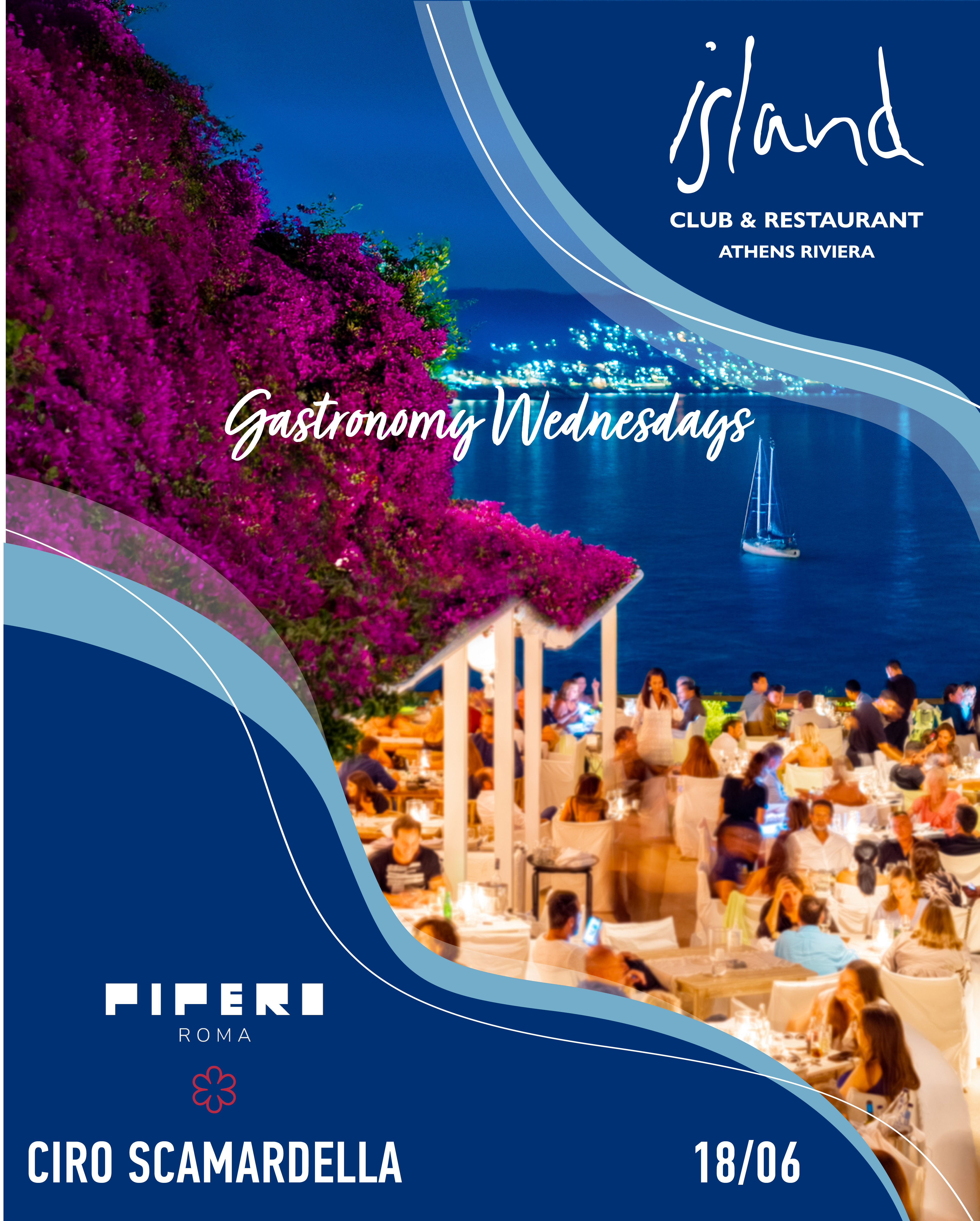 Την Τετάρτη 18 Ιουνίου, το Island υποδέχεται τον διακεκριμένο Ιταλό chef Ciro Scamardella, που έρχεται απευθείας από το φημισμένο εστιατόριο Pipero Roma, βραβευμένο με αστέρι Michelin. Γνωστός για τη σύγχρονη προσέγγισή του στην ιταλική κουζίνα και τη δημιουργική του ενέργεια, ο Ciro παρουσιάζει ένα αποκλειστικό tasting menu σχεδιασμένο ειδικά για το Island, συνδυάζοντας μεσογειακές γεύσεις με avant–garde τεχνικές.