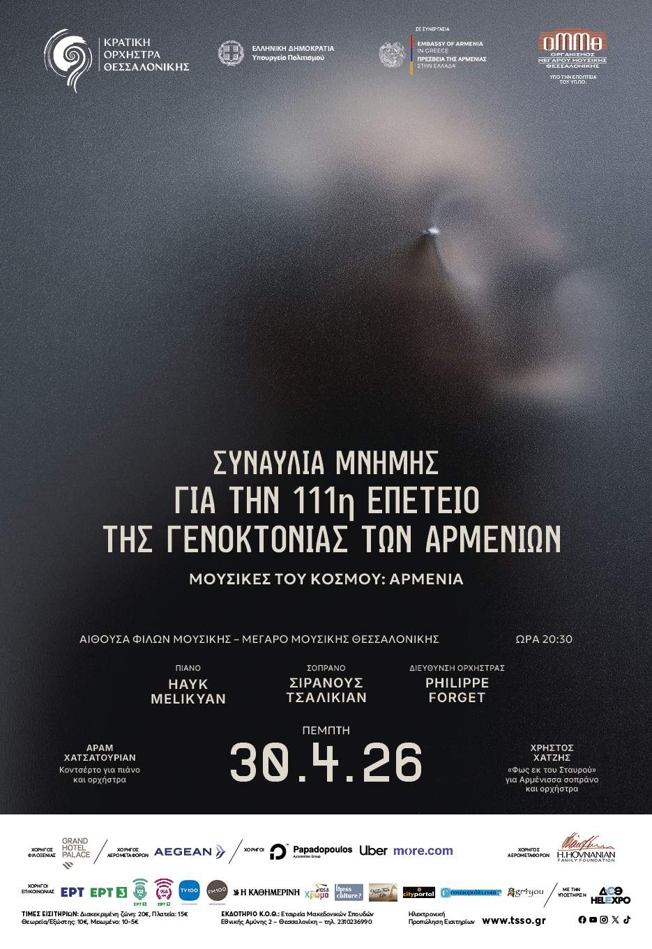 Το Μέγαρο Μουσικής Θεσσαλονίκης και η Κρατική Ορχήστρα Θεσσαλονίκης τιμούν την 111η επέτειο της Γενοκτονίας των Αρμενίων με μία συναυλία μνήμης που περιλαμβάνει δύο υπέροχα έργα των Αράμ Χατσατουριάν και του Χρήστου Χατζή και φιλοξενεί σπουδαίους καλλιτέχνες επί σκηνής. Η συναυλία πραγματοποιείται σε συνεργασία με την Πρεσβεία της Δημοκρατίας της Αρμενίας στην Ελλάδα.
