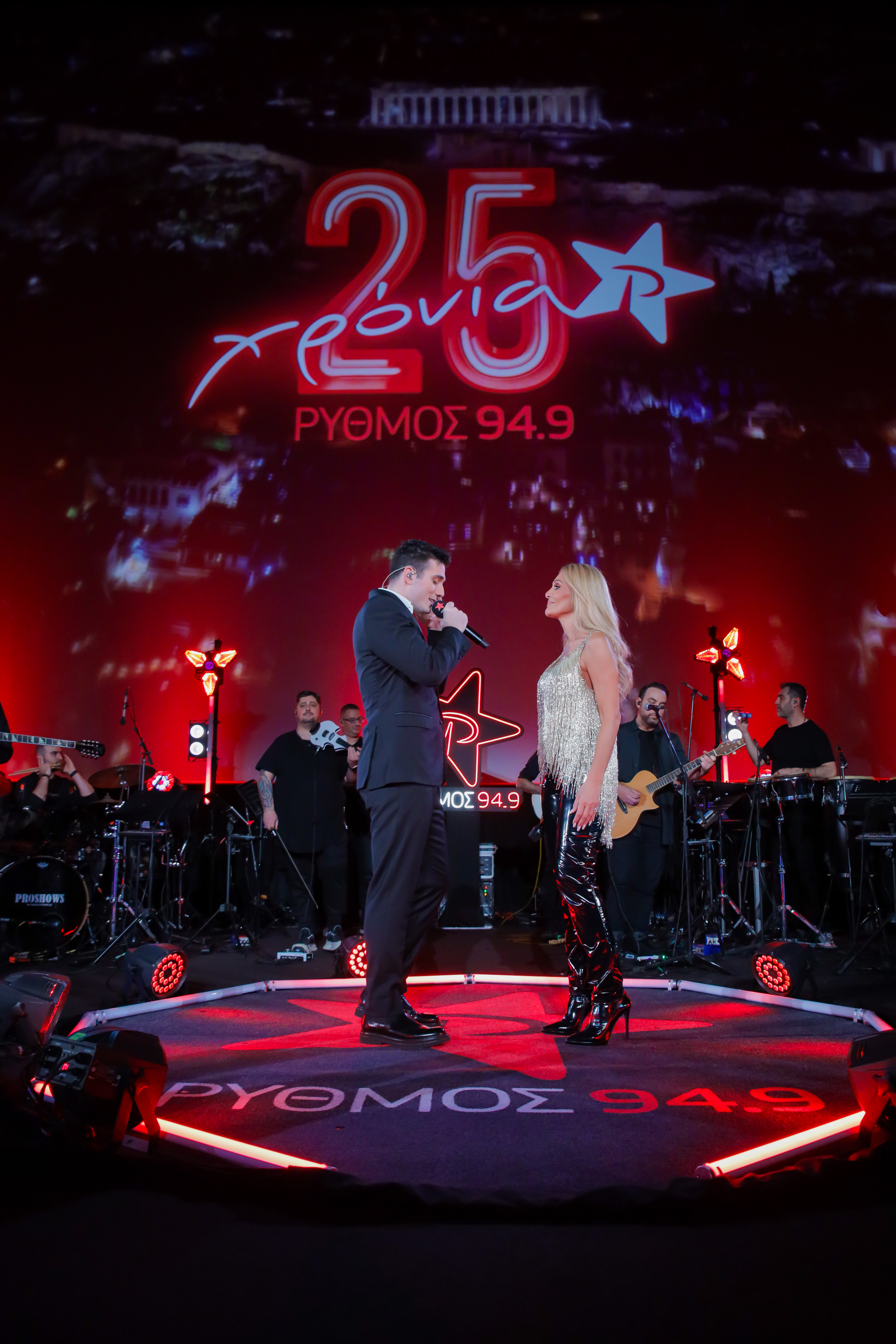 Ο Γιώργος Κακοσαίος, ένας από τους κορυφαίους τραγουδιστές της γενιάς του, και η διαχρονική ερμηνεύτρια, Νατάσα Θεοδωρίδου, ανέβηκαν στη σκηνή του «Πέφτει η νύχτα με…ΡΥΘΜΟ» και μαζί, δημιούργησαν ένα μουσικό υπερθέαμα. Ο Γιώργος Κακοσαίοςάνοιξε την αυλαία της μουσικής «νύχτας» με δικά του μεγάλα hits,όπως το «Τέτοια ώρα τέτοια λόγια», το «Σάββατο Βράδυ», η «Μοναξιά», ανεβάζοντας εξαρχής τη διάθεση στα ύψη. Συγκινητικές ήταν και οι στιγμές που ο Γιώργος Κακοσαίος ερμήνευσε τρία τραγούδια του Παντελή Παντελίδη, αποδίδοντας έτσι έναν φόρο τιμής για την επέτειο των 9 χρόνων απουσίας του αγαπημένου καλλιτέχνη. Λίγο αργότερα, ο αγαπημένος καλλιτέχνης υποδέχτηκε στη σκηνή τη μοναδική Νατάσα Θεοδωρίδου, η οποία καθήλωσε το κοινό με επιτυχίες από το νέο της άλμπουμ, αλλά και διαχρονικά τραγούδια της προσωπικής της δισκογραφίας, που όλοι έχουμε αγαπήσει, όπως το«Δεν επιτρέπεται», το «Παραδόθηκα σε σένα» και το « Τι φταίω». Στο κλείσιμο της βραδιάς ο Γιώργος Κακοσαίος και η Νατάσα Θεοδωρίδου ένωσαν τις φωνές τους και ερμήνευσαν μεγάλες επιτυχίες, που έχουν ακουστεί στα 25 χρόνια του ΡΥΘΜΟΥ 94.9,όπως το«Τώρα θα πονάς», το «Ομολογώ» και το «Φοβάμαι πως», δίνοντας μία νότα νοσταλγίας στο κοινό.