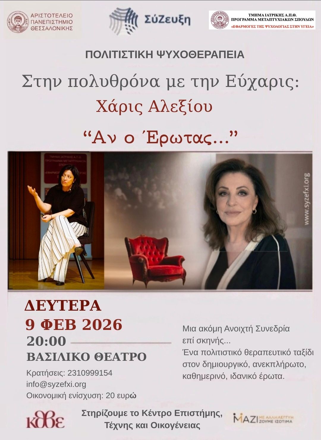 Πολιτιστική Ψυχοθεραπεία, που παρουσιάστηκε για πρώτη φορά τον Απρίλιο 2025 και έχει ως τώρα προσελκύσει πάνω από 2500 θεατές, η Πολυθρόνα με την Εύχαρις επιστρέφει στην Σκηνή του Βασιλικού Θεάτρου, από το Αριστοτέλειο Πανεπιστήμιο Θεσσαλονίκης, και το Κέντρο Επιστήμης, Τέχνης, και Οικογένειας, ΣύΖευξη με τιμώμενη προσκεκλημένη την Χαρούλα Αλεξίου.