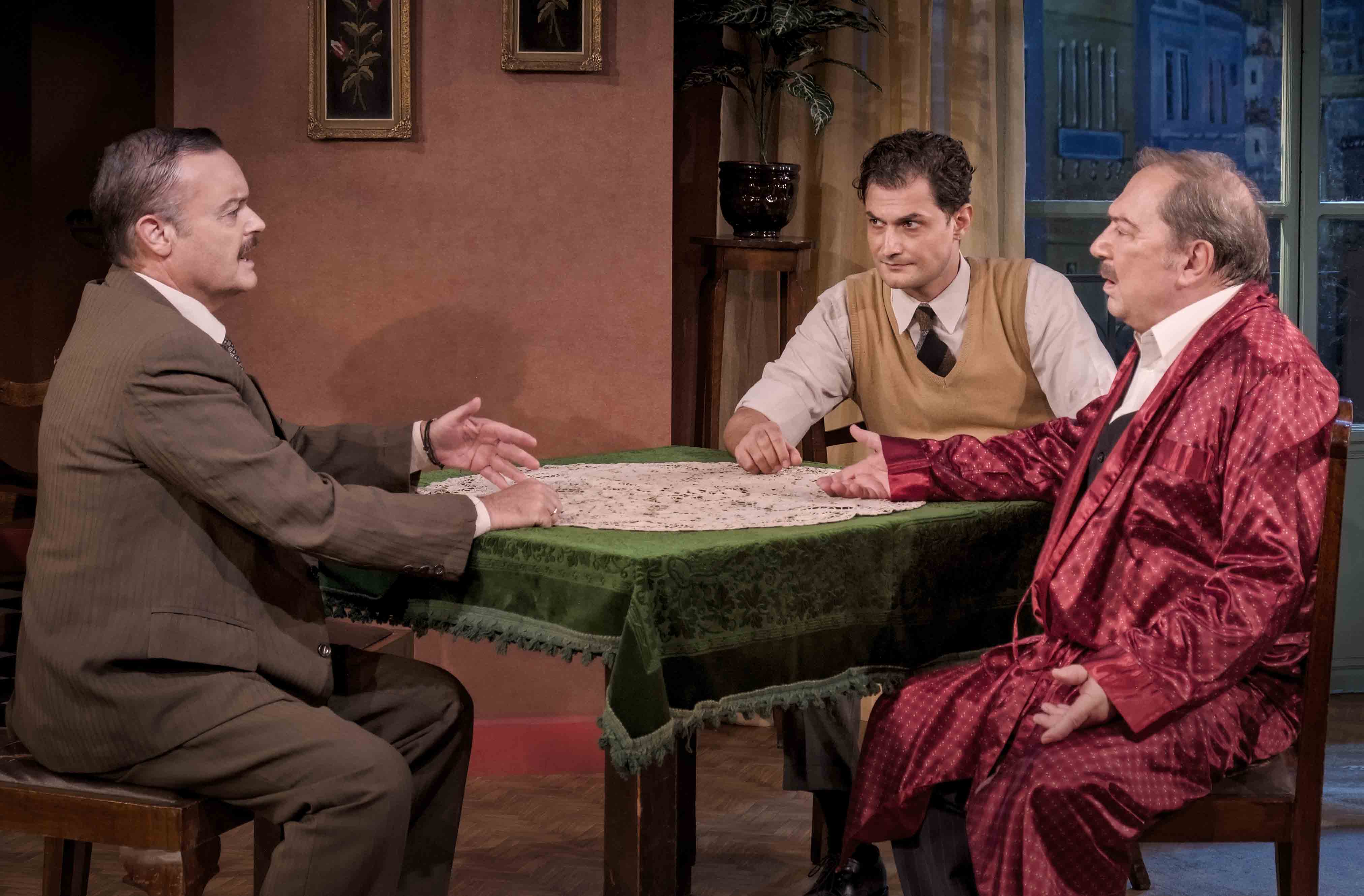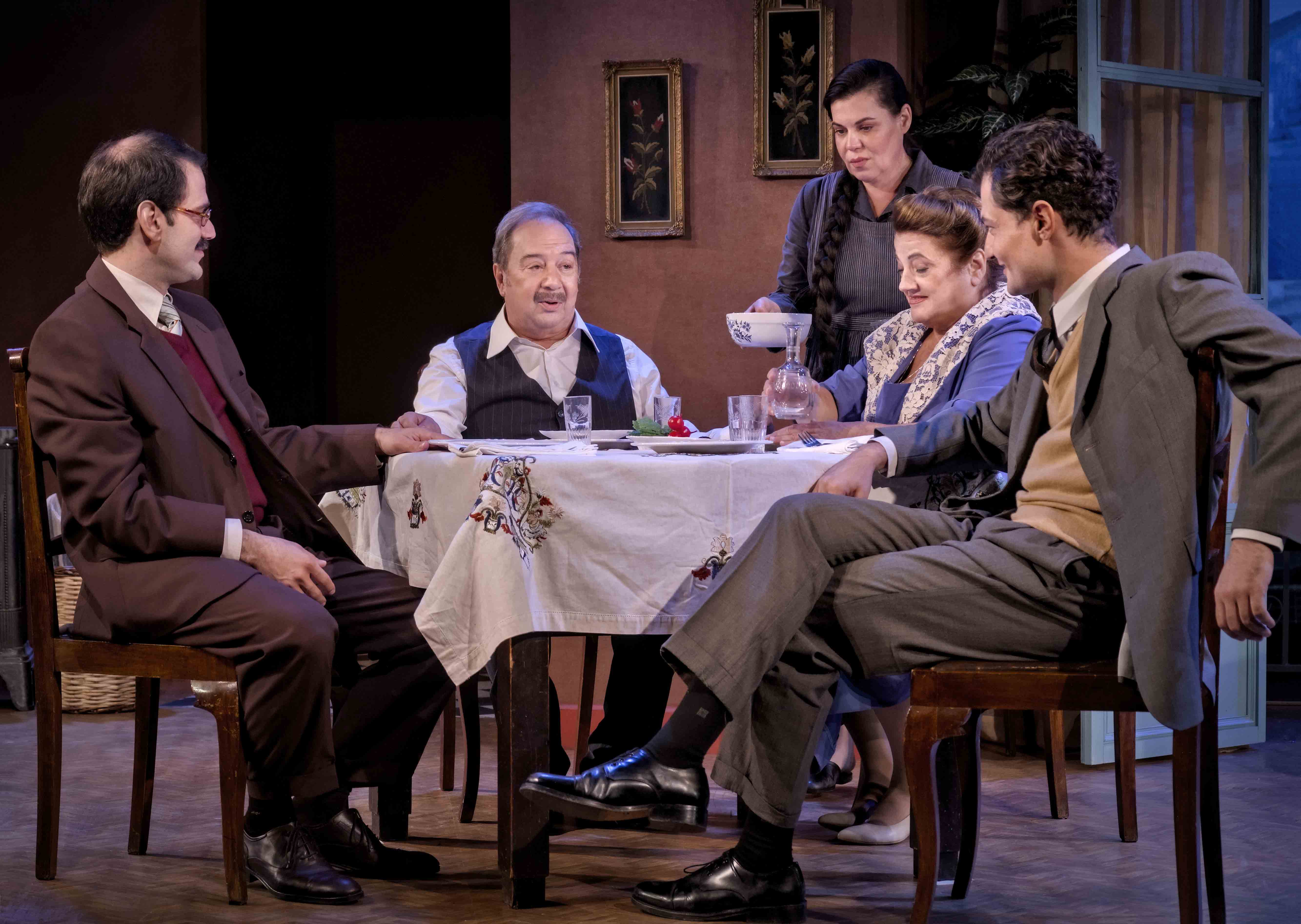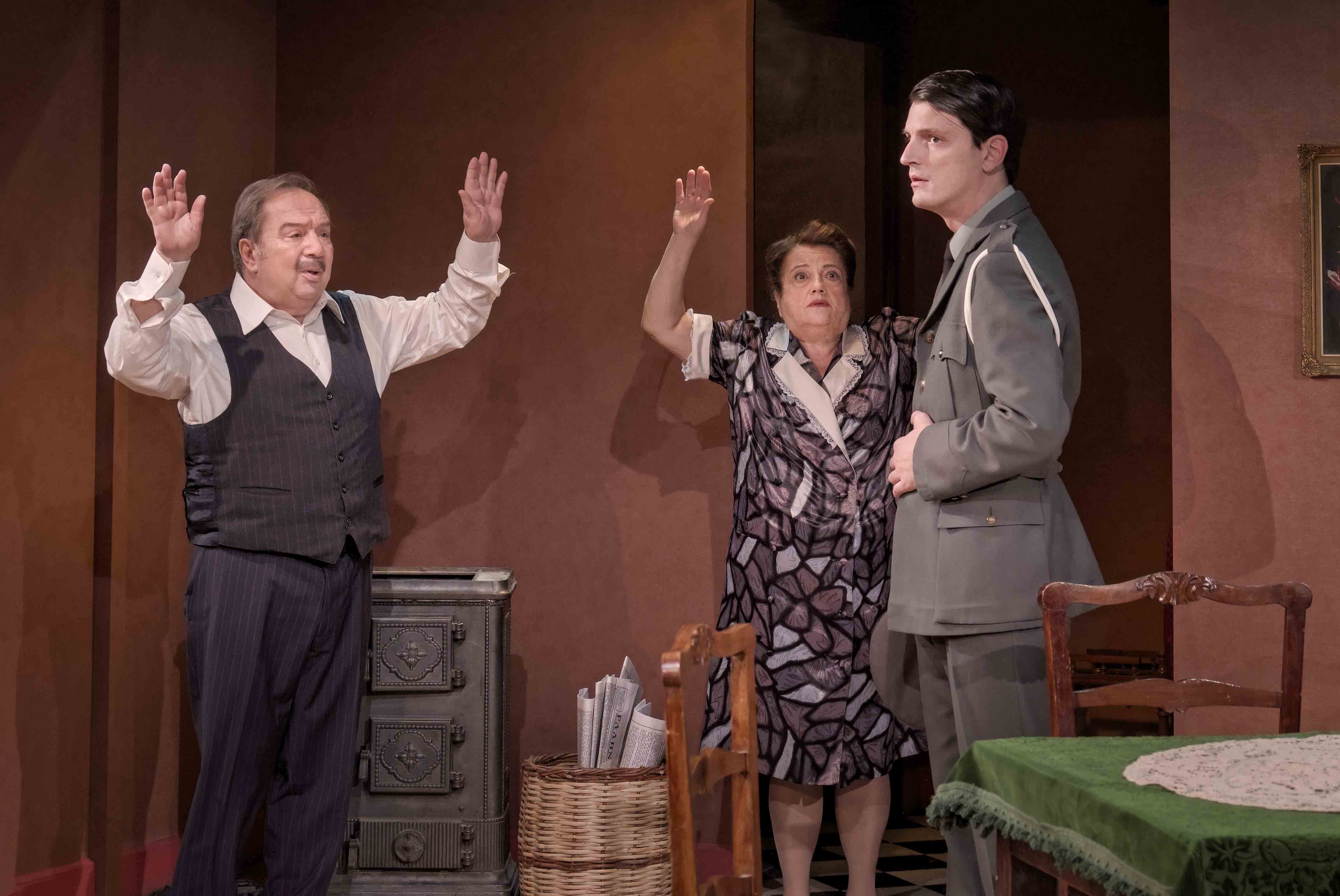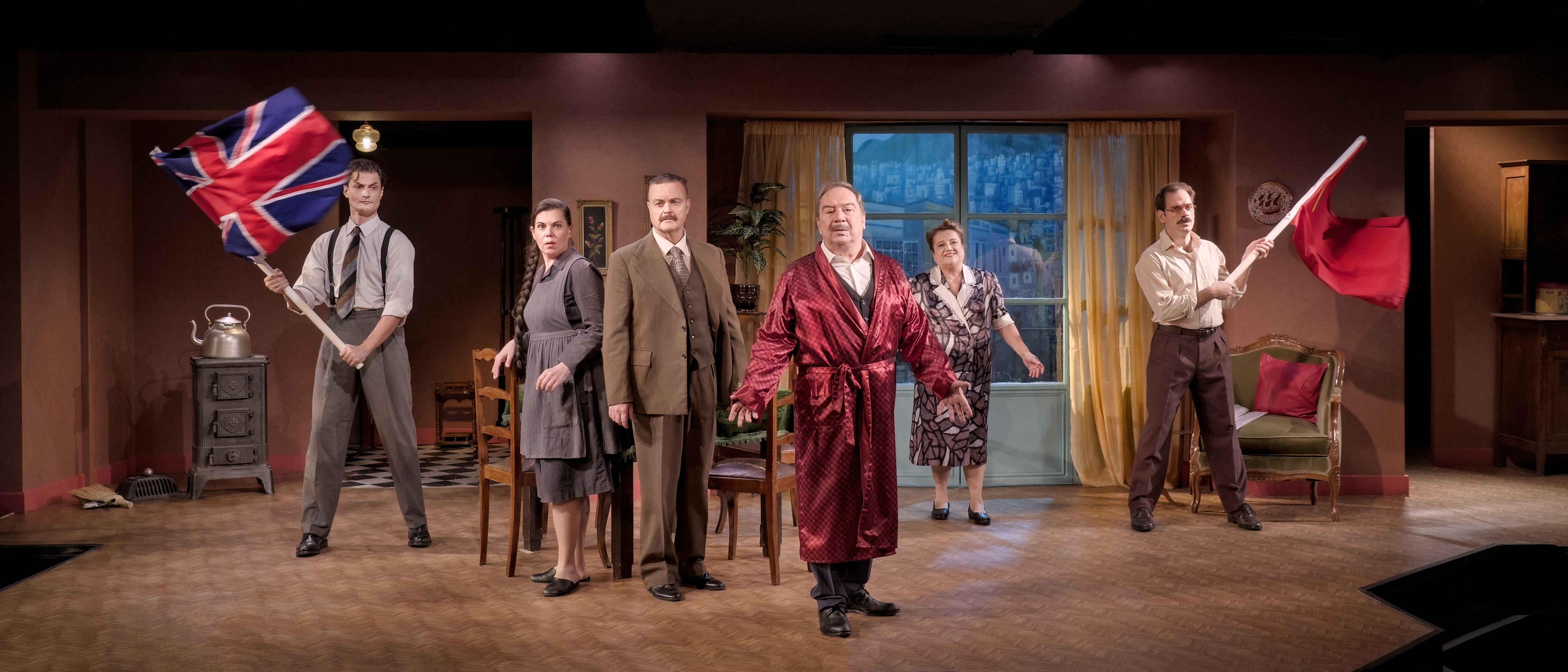 Στην παράσταση, ο Σταμάτης Φασουλής ερμηνεύει τον κυρ-Παντελή και η Ελένη Καστάνη τη σύζυγό του, Αθηνά. Ο Απόστολος Καμιτσάκηςείναι ο Σταύρος, ο δεξιός γιος και ο Γιώργος Βουρδαμής, είναι ο Κώστας, ο αριστερός γιος.