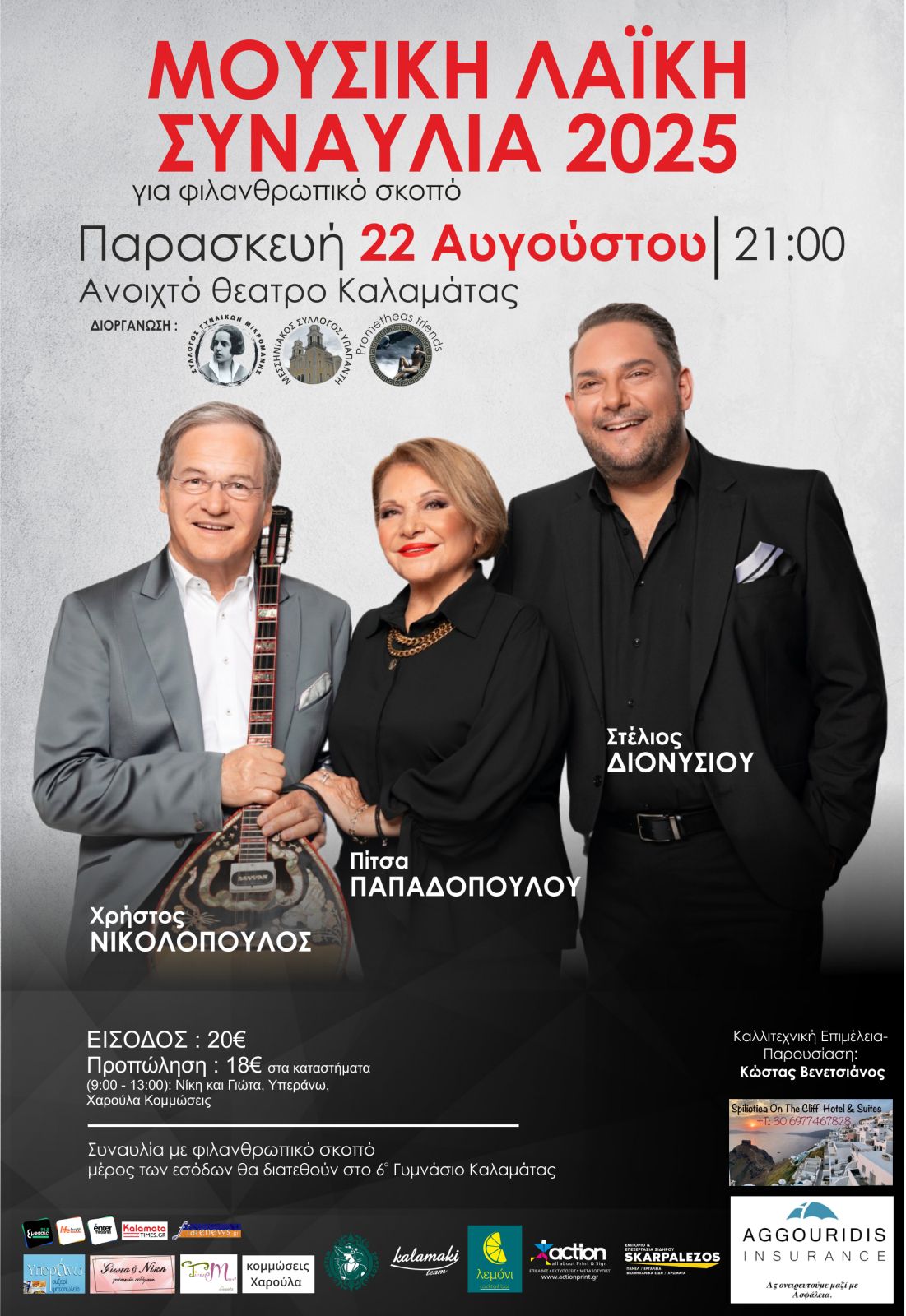 Μια ξεχωριστή βραδιά γεμάτη αυθεντικό λαϊκό τραγούδι και προσφορά στον συνάνθρωπο ετοιμάζεται να ζήσει η Καλαμάτα την Παρασκευή 22 Αυγούστου 2025, στις 21:00, στο Ανοιχτό Θέατρο Καλαμάτας. Στη σκηνή θα ανέβουν τρεις κορυφαίοι εκπρόσωποι του ελληνικού λαϊκού τραγουδιού: ο Χρήστος Νικολόπουλος, η Πίτσα Παπαδοπούλου και ο Στέλιος Διονυσίου, σε μια μοναδική μουσική σύμπραξη που υπόσχεται να μείνει αξέχαστη!