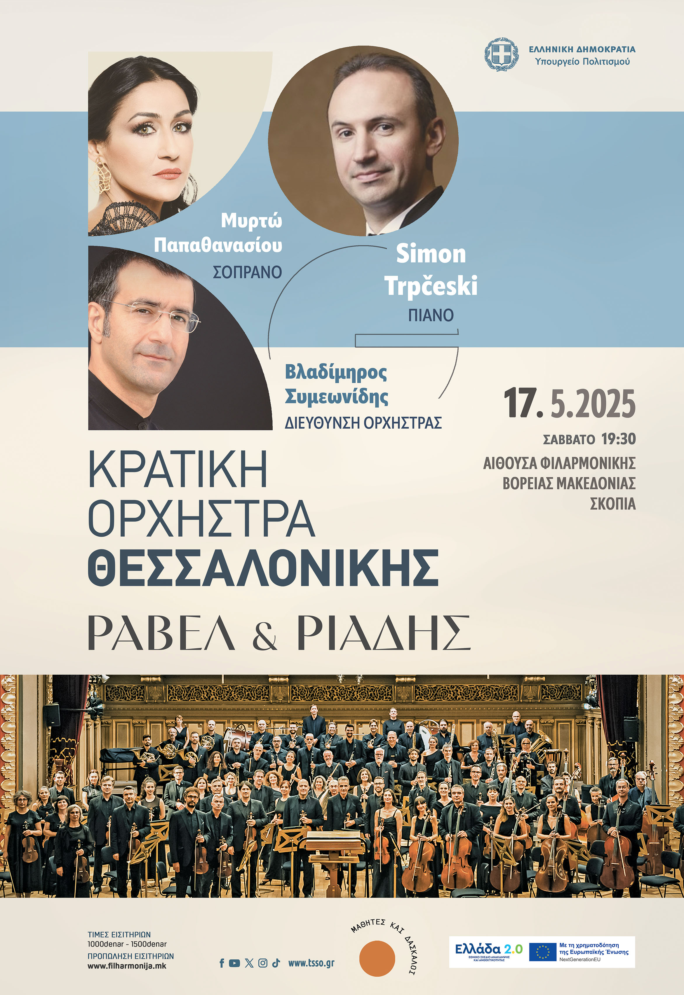 Η Κρατική Συμφωνική Ορχήστρα Θεσσαλονίκης εμφανίζεται στα Σκόπια, για πρώτη φορά στην 66χρονη ιστορία της, με έργα των Αιμίλιου Ριάδη και Μωρίς Ραβέλ και ξεχωριστούς καλεσμένους από τις δύο χώρες, όπως την κορυφαία Ελληνίδα σοπράνο Μυρτώ Παπαθανάσιου και τον παγκοσμίου φήμης πιανίστα Simon Trpčeski από τη Βόρεια Μακεδονία. Την Κ.Ο.Θ. διευθύνει ο διακεκριμένος Έλληνας μαέστρος Βλαδίμηρος Συμεωνίδης, η συμφωνική σουίτα του οποίου από την όπερα ‘Γαλάτεια’ του Αιμίλιου Ριάδη θα παρουσιαστεί σε παγκόσμια πρώτη εκτέλεση στη συναυλία αυτή.