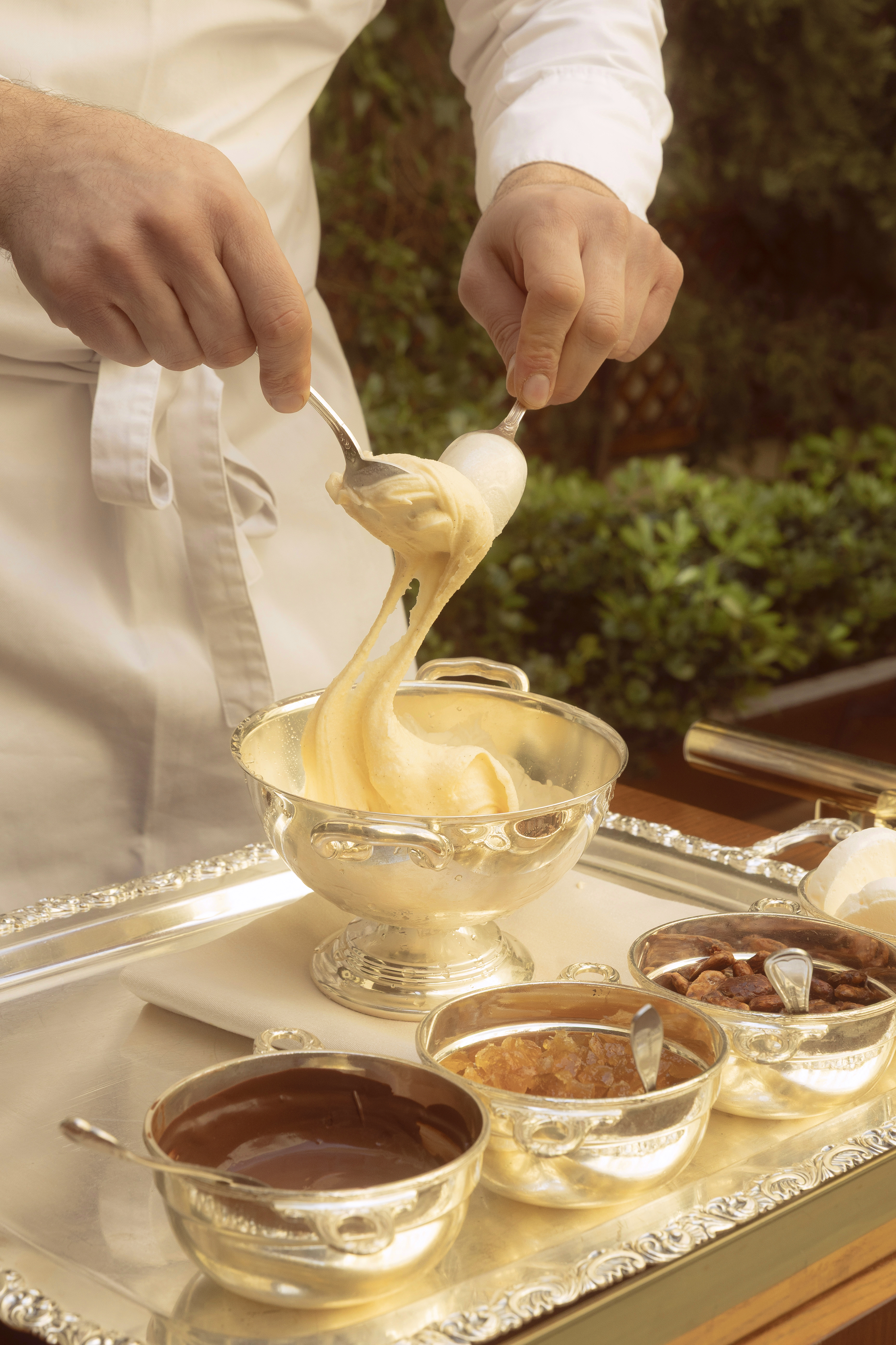 Η εμπειρία ολοκληρώνεται ιδανικά με τις εξαιρετικές γλυκές δημιουργίες του Pastry Chef Αλέξανδρου Κούφα. Το θεαματικό Armenonville ετοιμάζεται μπροστά στους επισκέπτες, με φρέσκο παρφέ που μαλακώνεται απαλά και εμπλουτίζεται με καραμελωμένους ξηρούς καρπούς και μαρέγκες, πριν σερβιριστεί με ζεστή σάλτσα σοκολάτας. Το τιραμισού παραμένει σταθερά στο μενού αυθεντικό και βελούδινο, ενώ το χειροποίητο gelato, παρασκευασμένο καθημερινά με φρέσκα φρούτα εποχής και αγνές πρώτες ύλες, προσφέρει μια δροσιστική νότα για φινάλε.
