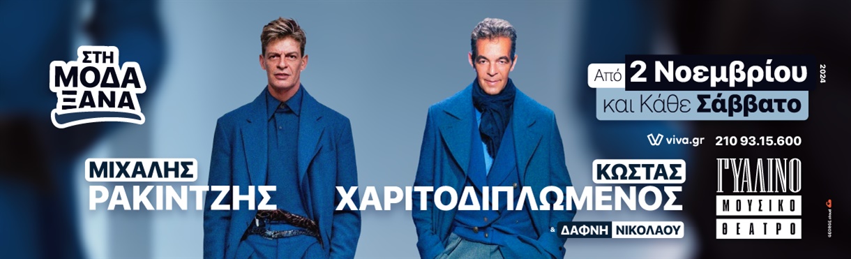Ο Μιχάλης Ρακιντζής και ο Κώστας Χαριτοδιπλωμένος είναι Στη Μόδα Ξανά! Οι δυο πετυχημένοι μουσικοσυνθέτες και τραγουδοποιοί ενώνουν και πάλι τις δυνάμεις τους για τις πιο φουτουριστικά-νοσταλγικές βραδιές στη μουσική σκηνή του Γυάλινου Μουσικού Θεάτρου.