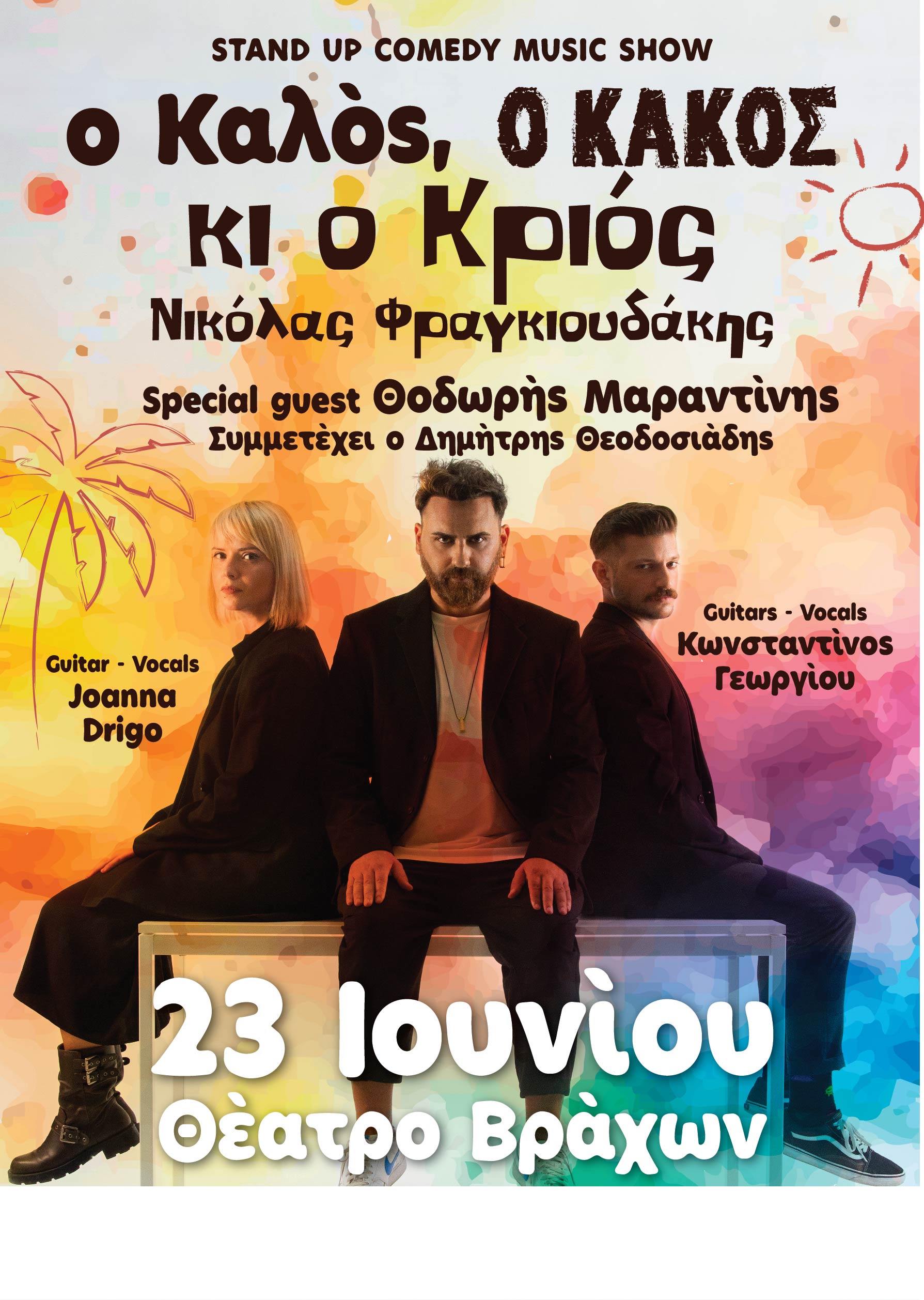 Ο κωμικός Νικόλας Φραγκιουδάκης επιστρέφει με το νέο του stand-up comedy music show «Ο Καλός, ο Κακός κι ο Κριός», μια απολαυστική παράσταση βασισμένη στα ζώδια με live μουσική, η οποία θα παρουσιαστεί στις 23 Ιουνίου 2025 στο Θέατρο Βράχων με καλεσμένους τους Θοδωρή Μαραντίνη και Δημήτρη Θεοδοσιάδη.