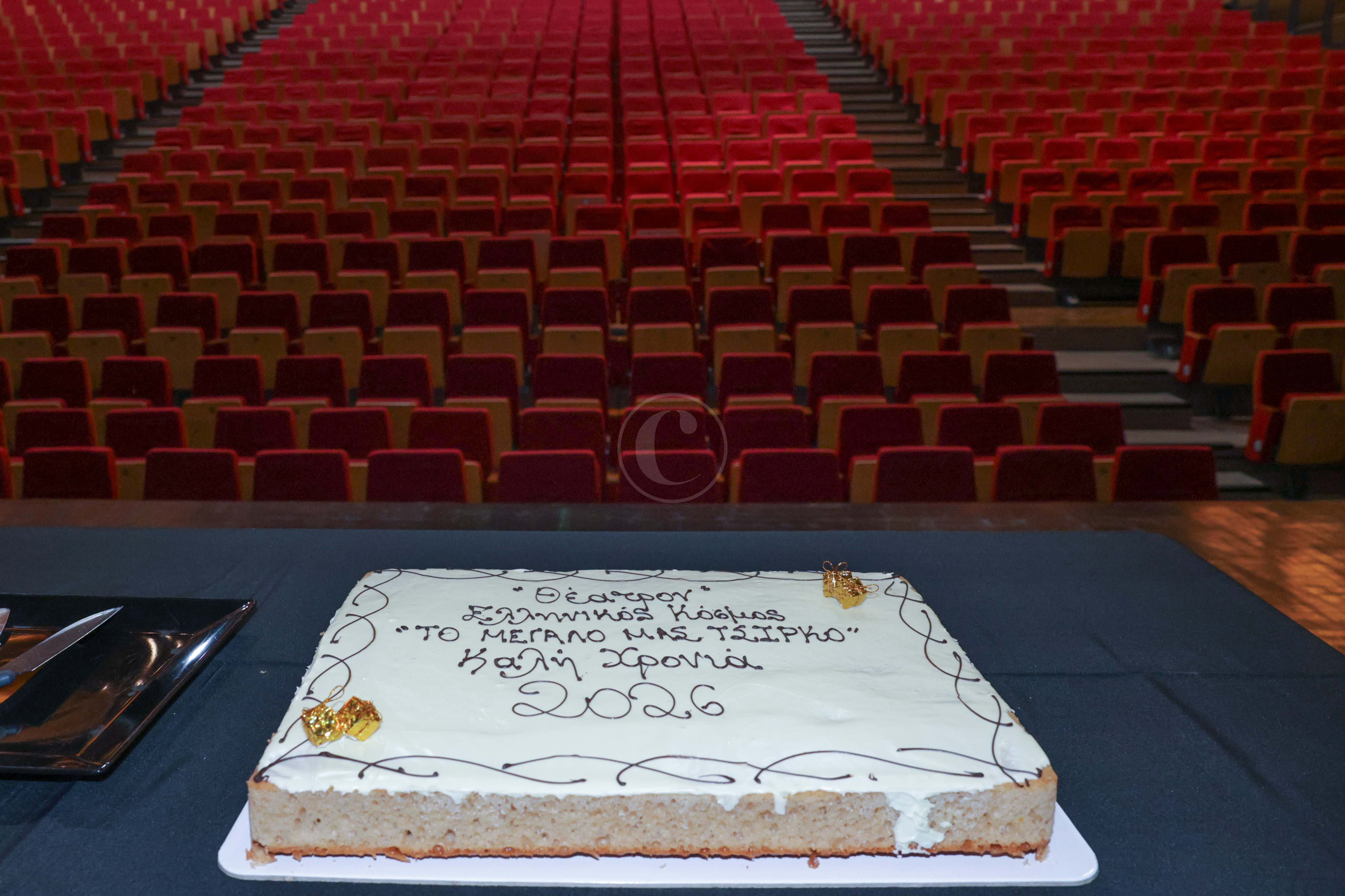 Ο 27μελής θίασος και οι συντελεστές της παράστασης “Το μεγάλο μας τσίρκο” υποδέχτηκαν τη νέα χρονιά με την καθιερωμένη κοπή της βασιλόπιτας, παρουσία της Εκτελεστικής Αντιπρόεδρου του Ιδρύματος Μείζονος Ελληνισμού & Πρόεδρου του Κέντρου Πολιτισμού «Ελληνικός Κόσμος», Σοφίας Κουνενάκη Εφραίμογλου, και του Διευθύνοντος Συμβούλου, Δημήτρη Εφραίμογλου, στο «Θέατρον» του Κέντρου Πολιτισμού «Ελληνικός Κόσμος».