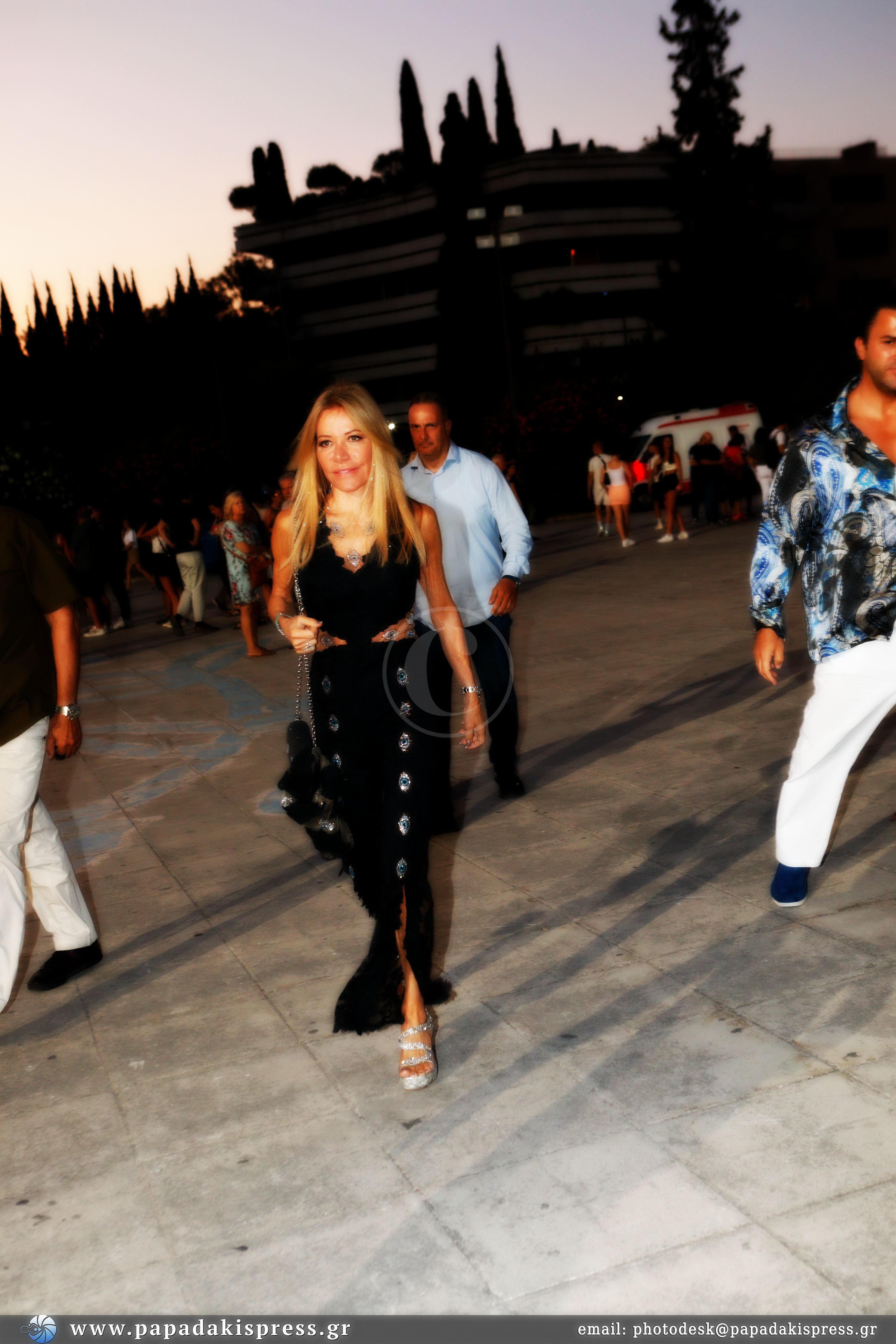Το look που επέλεξε για τη χθεσινή της εμφάνιση: Μαύρη ολόσωμη κεντητή φόρμα με λεπτομέρεια τα γαλάζια μάτια, ασημί τσαντάκι με δεμένο φουλάρι επίσης με μάτια και ασημένιες ψηλοτάκουνες πλατφόρμες.