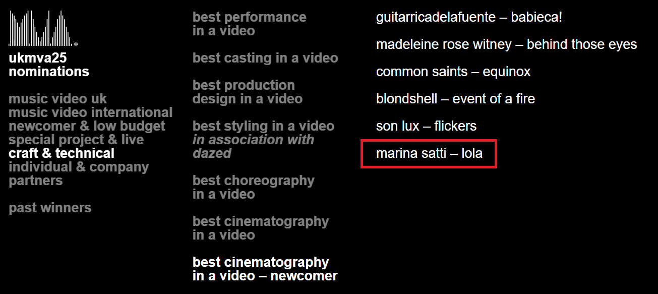 Η διεθνώς αναγνωρισμένη καλλιτέχνις, η πιο πολυσυζητημένη και genre-blending pop δημιουργός της Ελλάδας, Μαρίνα Σάττι, συνεχίζει να γράφει ιστορία στη σύγχρονη μουσική σκηνή. Για δεύτερη φορά στην καριέρα της διακρίνεται στα UK Music Video Awards, τον κορυφαίο θεσμό παγκοσμίως για το musicvideo και το musicfilmmaking: το 2022 με το “YIATI POULI’M” στην κατηγορία Best Alternative Video-Newcomer και τώρα, το 2025, επιστρέφει με το “LOLA” στην κατηγορία Craft & Technical: Best Cinematography in a Video-Newcomer.
