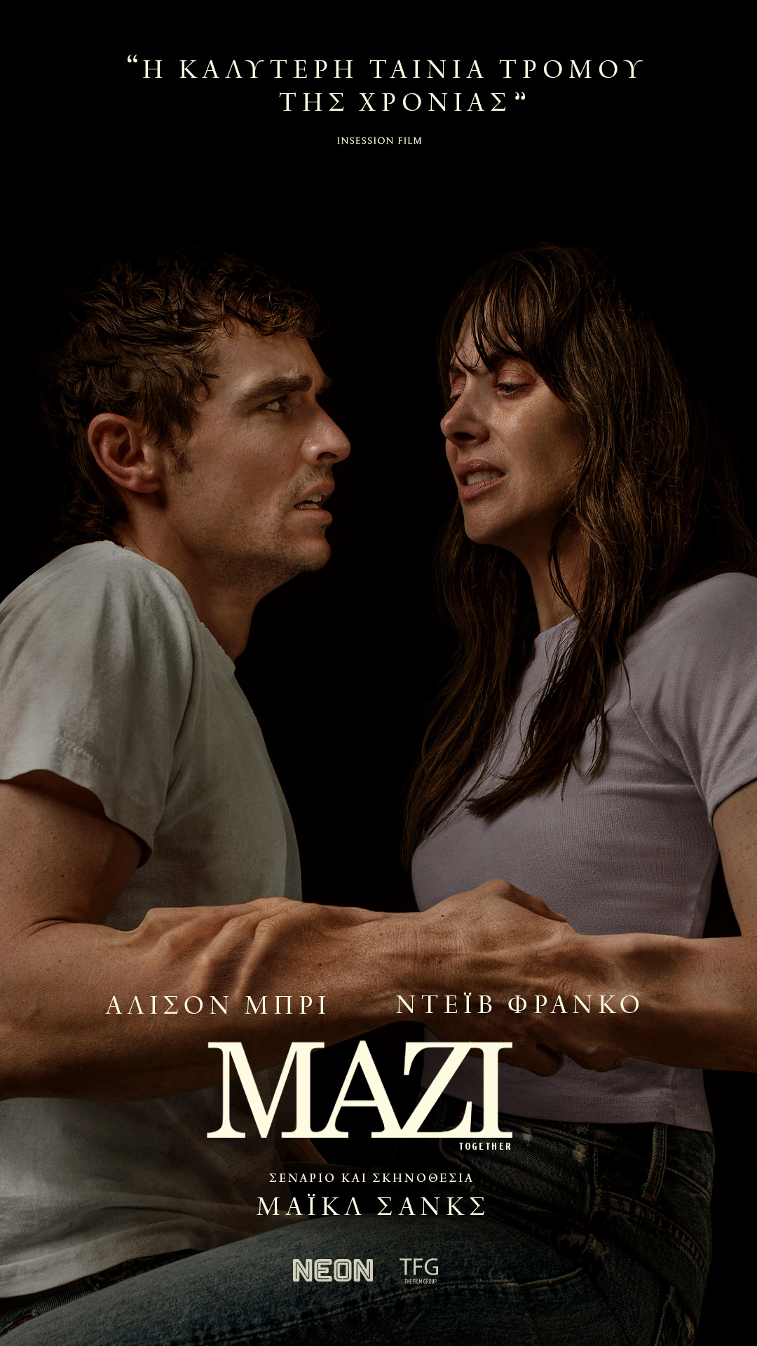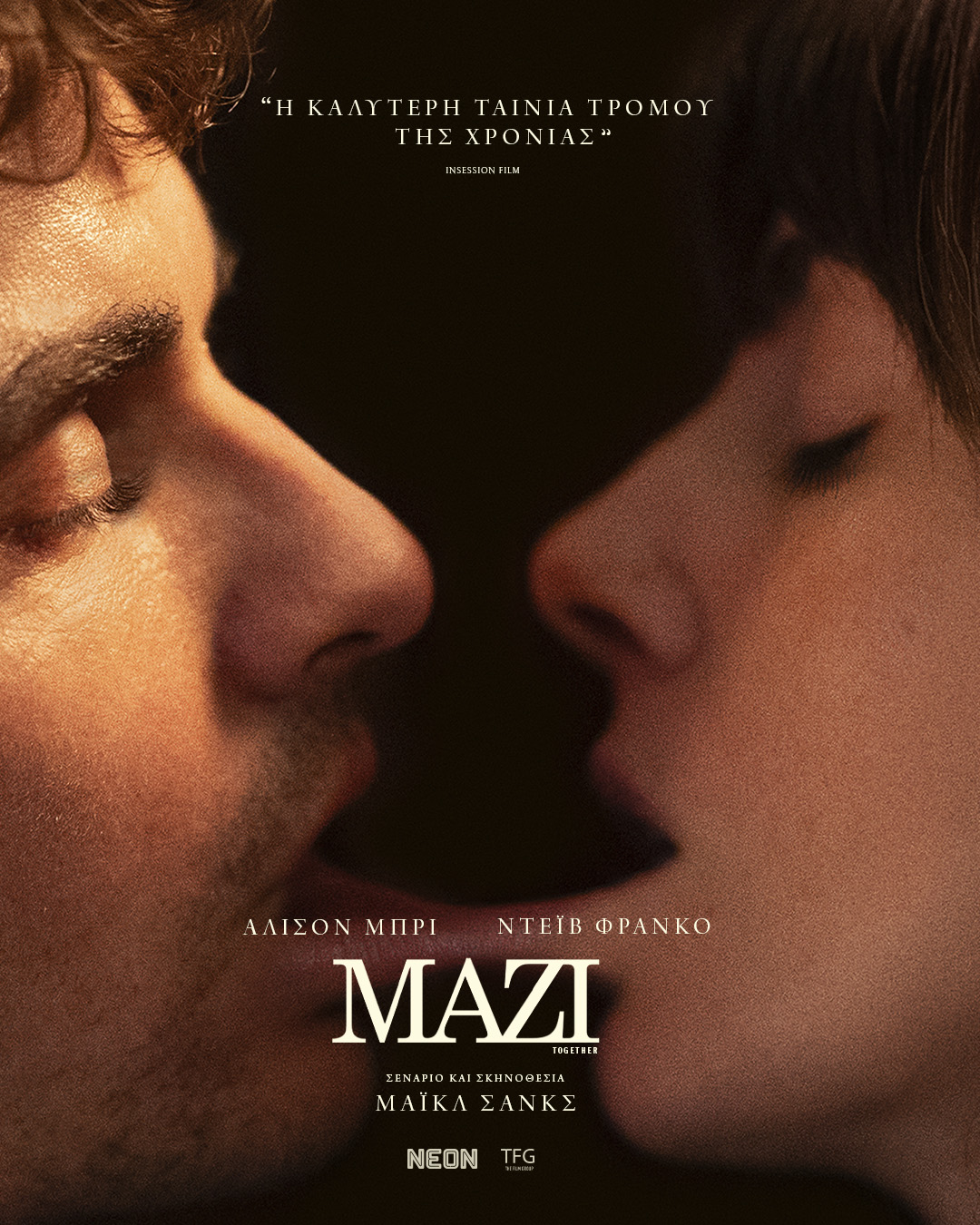 Μαζί (Τogether): Η Άλισον Μπρι (Community, Glow) και ο Ντέιβ Φράνκο (Now You See Me), ζευγάρι και στην πραγματική ζωή, πρωταγωνιστούν στην πιο αναμενόμενη ταινία τρόμου της χρονιάς. Η μετακόμιση ενός ζευγαριού στην εξοχή προκαλεί ένα μεταφυσικό συμβάν που αλλάζει ριζικά τη σχέση, την ύπαρξη, αλλά και τη σωματική μορφή του ζευγαριού. Η ταινία έκανε πρεμιέρα στο μεταμεσονύχτιο τμήμα του Sundance, όπου απέσπασε εξαιρετικές κριτικές. Τη διανομή της ταινίας στην Αμερική έχει η ΝΕΟΝ (Anora, Longlegs).