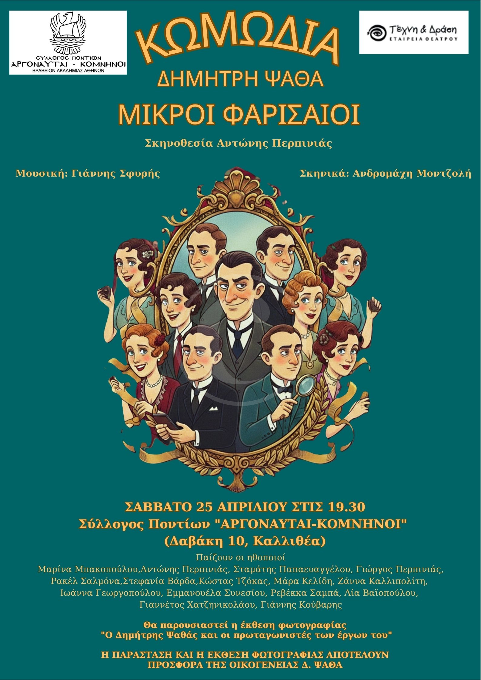 Η κωμωδία αυτή του Δημήτρη Ψαθά καθώς η έκθεση φωτογραφίας από τη ζωή του με τους πρωταγωνιστές των έργων του προσφέρονται από την οικογένεια του συγγραφέα στο Σύλλογο Ποντίων «Αργοναύται – Κομνηνοί», ένα σύλλογο στον οποίο ο συγγραφέας ανήκε όσο βρισκόταν εν ζωή και στον οποίο υπήρξε ενεργό και ιδρυτικό μέλος. Η εγγονή του Δημήτρη Ψαθά και εκδότρια των Απάντων του Λένα Νίτσου-Ψαθά μιλώντας μας για το αφιέρωμα Ψαθά είπε: «Η οικογένειά μας έχει αποφασίσει να προσφέρει κάθε χρόνο τιμής ένεκεν στο Σύλλογο Ποντίων «Αργοναύται-Κομνηνοί του οποίου ο παππούς μου Δ. Ψαθάς υπήρξε μέλος, μία κωμωδία του υπέρ του Ποντιακού κοινού. Πέρυσι το Νοέμβριο του 2025 παρουσιάστηκε με μεγάλη επιτυχία στο θέατρο του συλλόγου η κωμωδία του «Ζητείται Ψεύτης». Το Σάββατο 25 Απριλίου θα παρουσιάσουμε στο σύλλογο την κωμωδία του «Μικροί Φαρισαίοι» από τη θεατρική ομάδα του Αντώνη Περπινιά «Τέχνη και Δράση» και τον Οκτώβριο του 2026 θα προσφέρουμε στο σύλλογο ακόμα μια ακόμα κωμωδία του, την πολιτική του σάτιρα «Ξύπνα Βασίλη» από τη θεατρική ομάδα της Έφης Πίκουλα-Βουγιουκλάκη. Ακόμη το Σάββατο θα εγκαινιάσουμε στο Σύλλογο στο πλαίσιο του Αφιερώματος Ψαθά την έκθεση φωτογραφίας «Ο Δημήτρης Ψαθάς και οι πρωταγωνιστές των έργων του» όπου θα παρουσιάσουμε σπάνιες φωτογραφίες μεγάλων πρωταγωνιστών που ερμήνευσαν έργα του όπου εικονίζονται στις πρόβες και στις πρεμιέρες μαζί του ξεκινώντας από τους παλαιότερους όπως η Άννα Συνοδινού, ο Δημήτρης Χορν, η Μαίρη Αρώνη, ο Βασίλης Λογοθετίδης, ο Ντίνος Ηλιόπουλος, ο Μίμης Φωτόπουλος, ο Γιάννης Γκιωνάκης, η Ρένα Βλαχοπούλου, η Άννα Παναγιωτοπούλου, φτάνοντας μέχρι τους νεότερους που ερμήνευσαν Ψαθά στα πρώτα τους βήματα στο θεατρικό σανίδι όπως ο Γρηγόρης Βαλτινός, ο Γιώργος Κιμούλης, η Πολύνα Γκιωνάκη, καθώς και πιο πρόσφατα ο Σπύρος Παπαδόπουλος και η Δήμητρα Παπαδοπούλου».