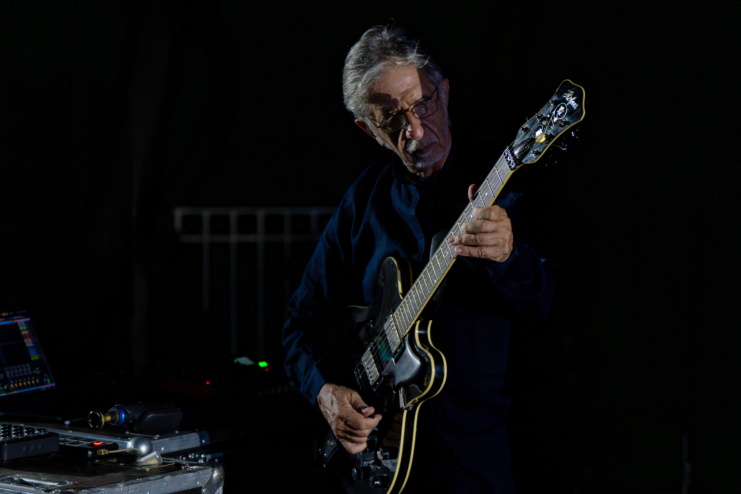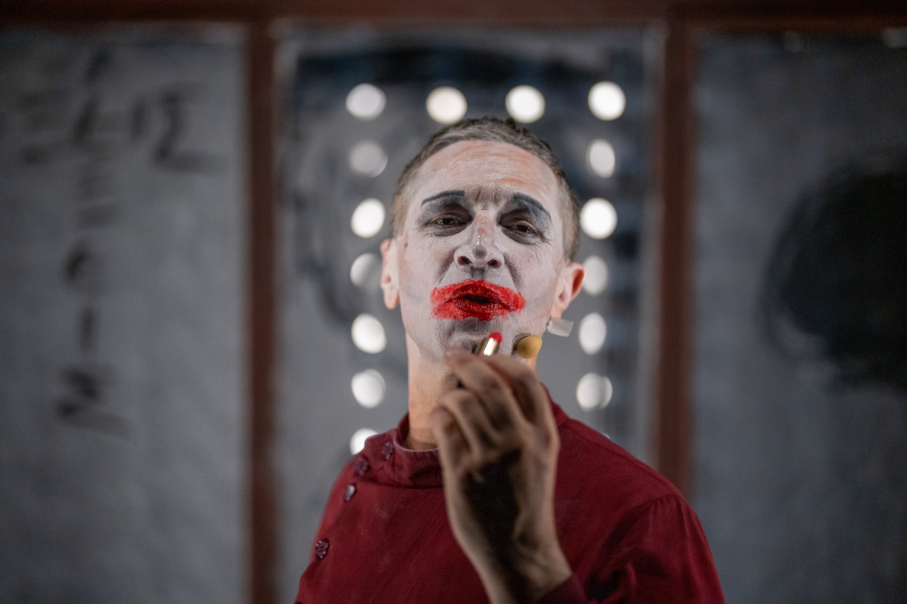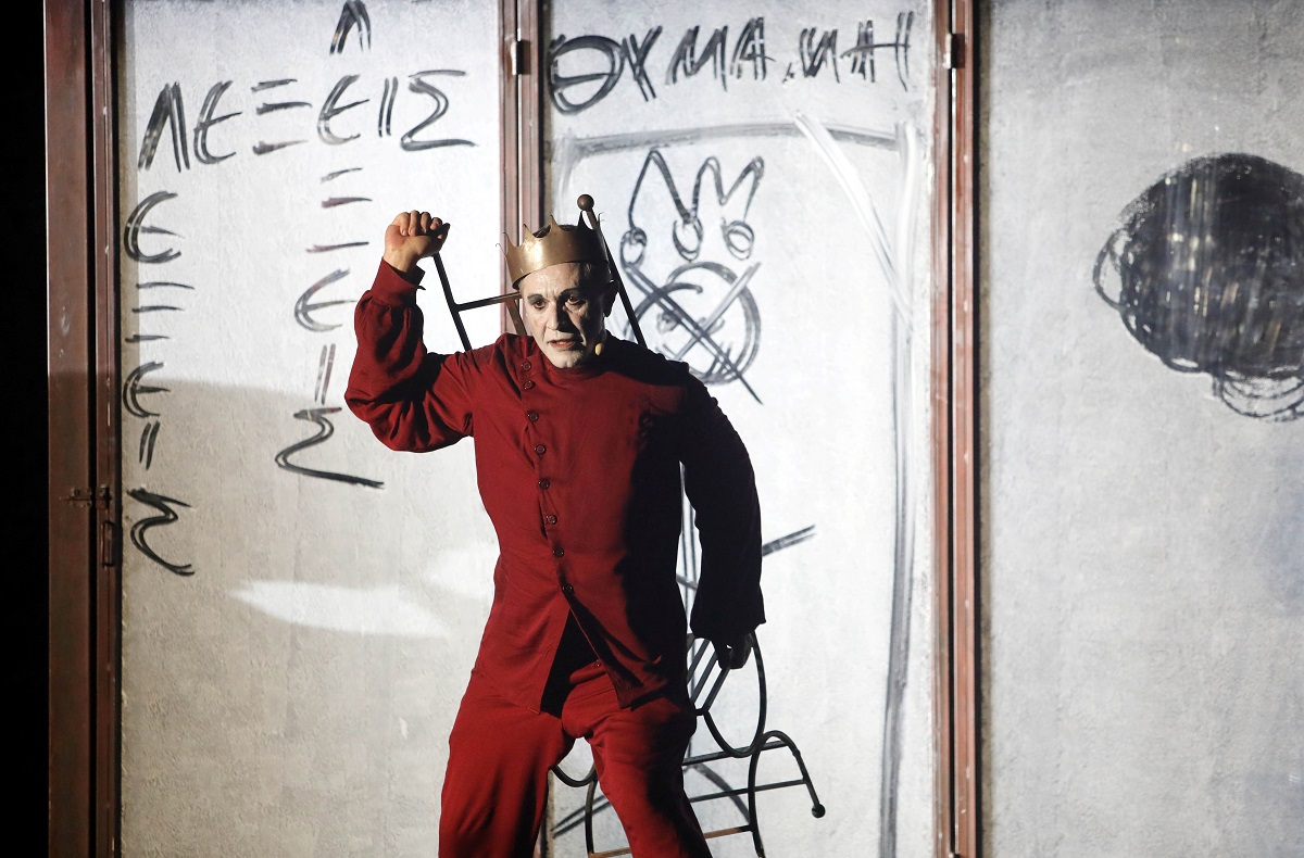 Δίπλα του, ο Δημήτρης Καμαρωτός δημιουργεί επί σκηνής έναν ηχητικό κόσμο που λειτουργεί σαν εσωτερική φωνή, σαν αντίλαλος του τραγικού ήρωα.
