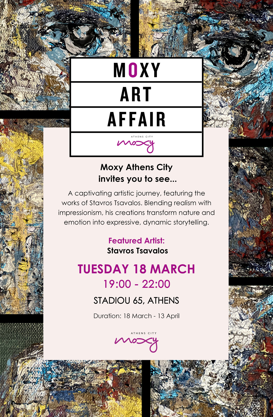 Η έκθεση θα είναι διαθέσιμη για το κοινό από τις 18 Μαρτίου έως τις 13 Απριλίου και εντάσσεται στη φιλοσοφία του MoxyArtAffair, μιας πρωτοβουλίας του MoxyAthensCity που στοχεύει στην ανάδειξη σύγχρονων καλλιτεχνών και τη δημιουργία ενός χώρου όπου η τέχνη και η φιλοξενία συναντώνται.