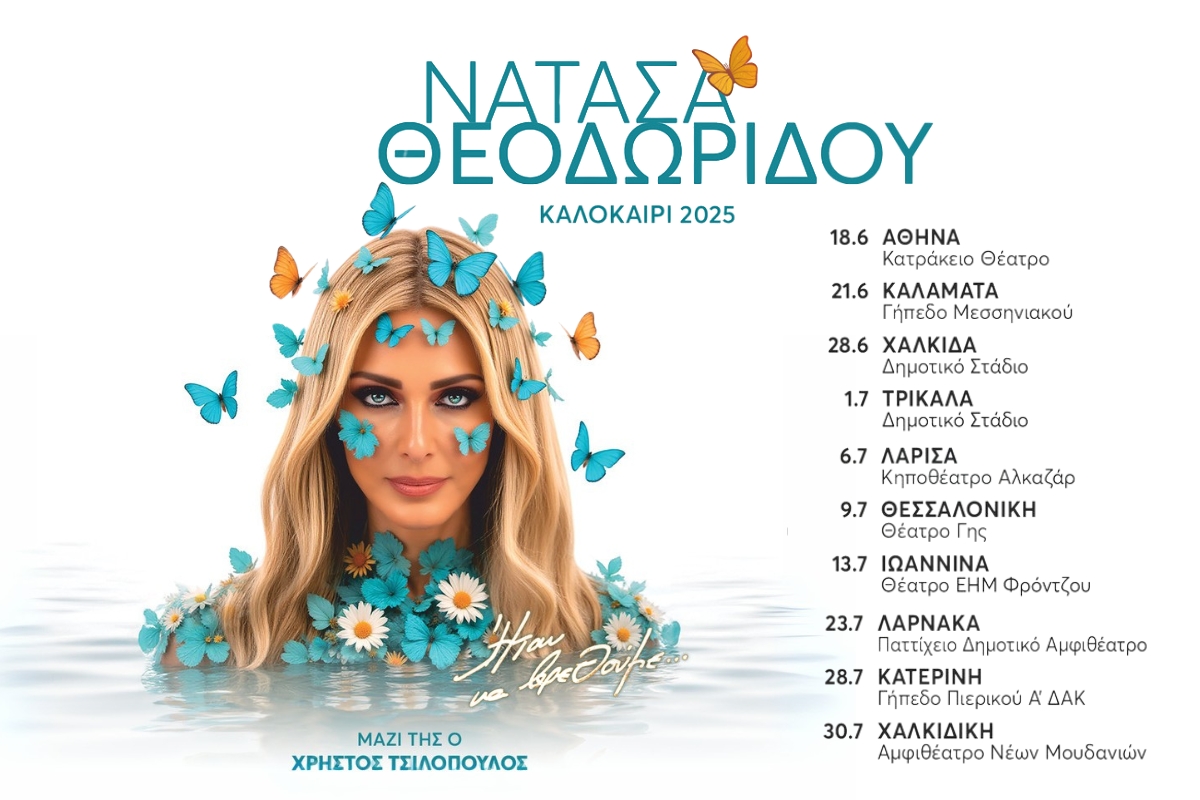 Η Νατάσα Θεοδωρίδου, η κορυφαία λαϊκή ερμηνεύτρια, ετοιμάζεται να ταξιδέψει σε όλη την Ελλάδα για μια ξεχωριστή καλοκαιρινή περιοδεία, γεμάτη συναίσθημα, ρυθμό και μοναδικές στιγμές!