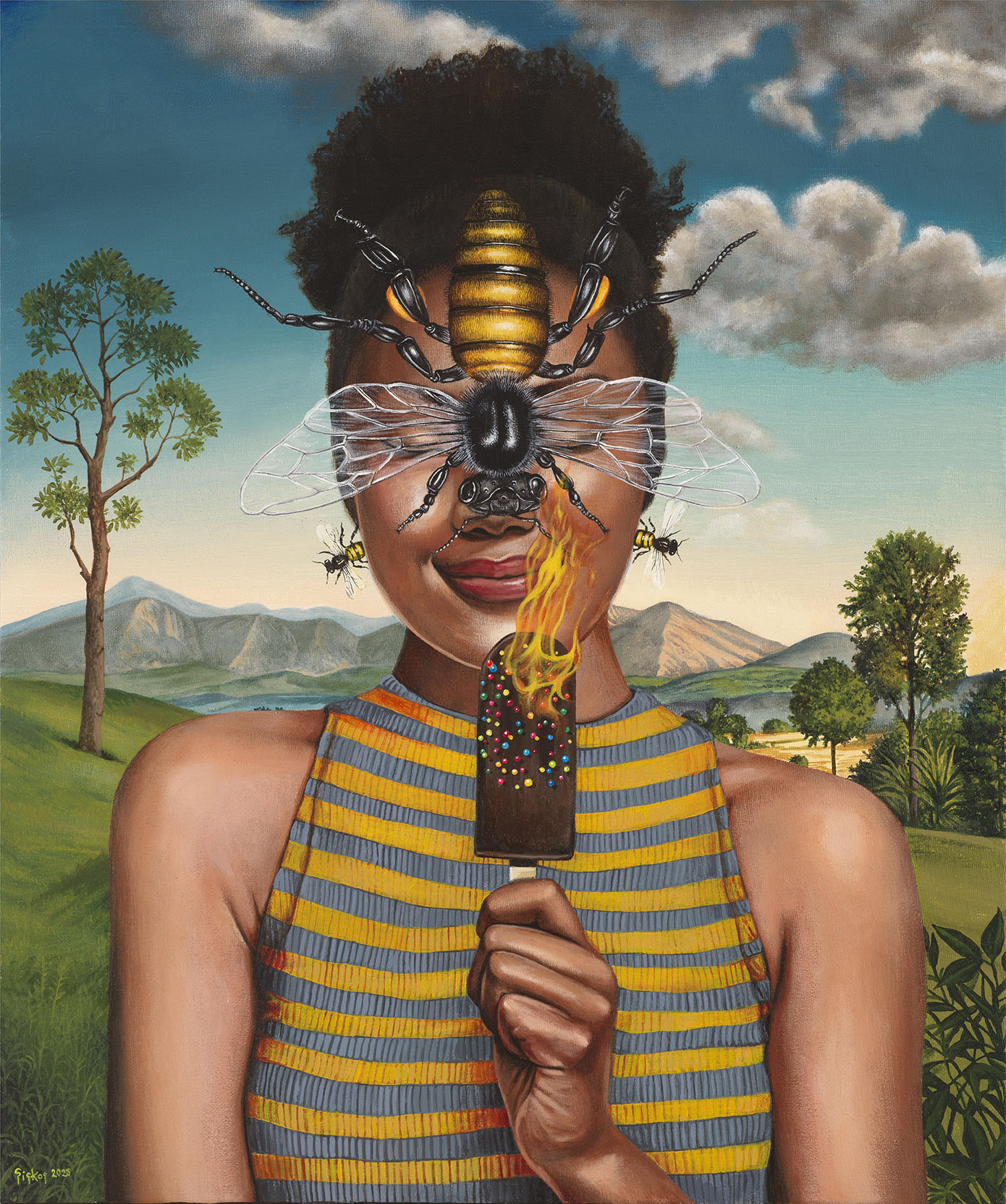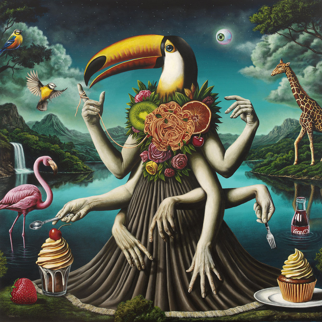Στα έργα του, ανθρώπινες μορφές εμφανίζονται να κρατούν γλυκίσματα, ενώ γύρω τους κινούνται έντομα, ζώα και παράδοξα στοιχεία που διαταράσσουν την οπτική ισορροπία. Το γλυκό συνυπάρχει με το απειλητικό, το ελκυστικό με το ανοίκειο. Η απόλαυση δεν παρουσιάζεται αθώα, εμπεριέχει ένταση και εσωτερική ταραχή.