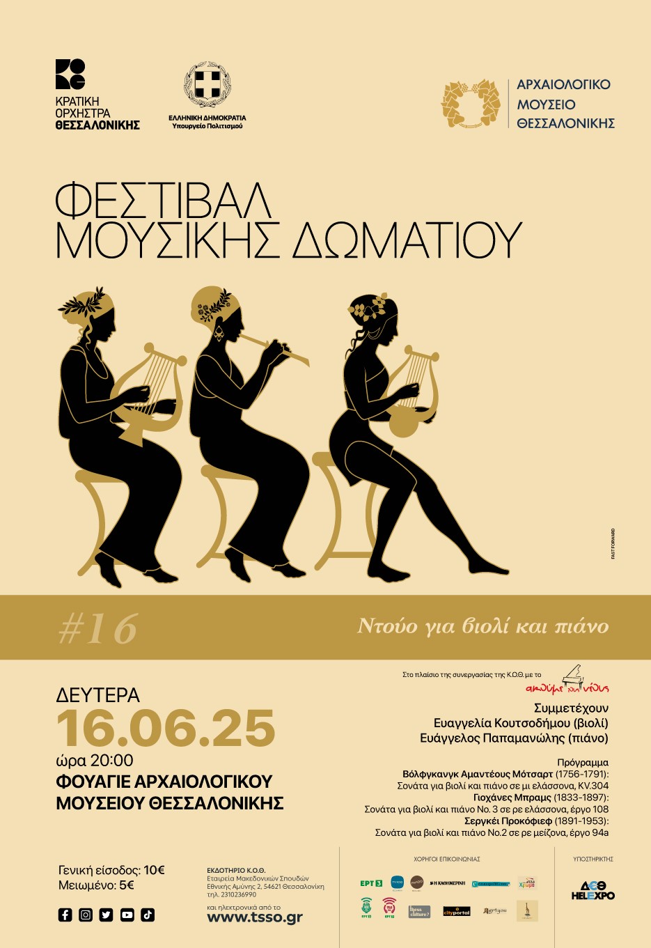 Το Φεστιβάλ Μουσικής Δωματίου που συνδιοργανώνουν η Κρατική Ορχήστρα Θεσσαλονίκης και το Αρχαιολογικό Μουσείο Θεσσαλονίκης, με την υποστήριξη του Υπουργείου Πολιτισμού, συνεχίζεται με μία ακόμη συναυλία στο πλαίσιο της συνεργασίας της Κ.Ο.Θ. με το πρόγραμμα ‘Ακούμε τους Νέους’, με το ντούο για βιολί και πιάνο των ταλαντούχων μουσικών Ευαγγελίας Κουτσοδήμου (βιολί) και Ευάγγελου Παπαμανώλη (πιάνο), σε έργα Μότσαρτ, Μπραμς και Προκόφιεφ.
