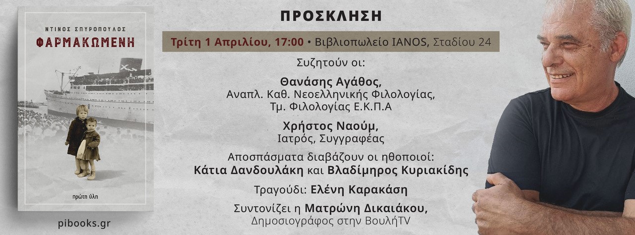 Αυτή είναι με δυο λόγια η υπόθεση του πρώτου μυθιστορήματος που έγραψε ο γνωστός ηθοποιός και σκηνοθέτης Ντίνος Σπυρόπουλος με τίτλο “Φαρμακωμένη” που κυκλοφορεί από τις Εκδόσεις Πρώτη Ύλη. Πρόκειται για ένα αστυνομικό μυθιστόρημα εποχής σε μια Ελλάδα που προσπαθεί να επουλώσει τις πληγές της. Με συναρπαστική κινηματογραφική πλοκή, γεμάτη ανατροπές και με τη νοσταλγία μιας παλιάς ελληνικής ταινίας. Το µυθιστόρηµα “Φαρµακωµένη” είναι το πρώτο µιας τριλογίας µε ήρωα τον χωροφύλακα ∆αγρέ και γράφτηκε το καλοκαίρι του 2024 στο χωριό Νεράιδα του νομού Φθιώτιδας. Σειρά έχουν το “Χιόνισε στο Λιανοκλάδι” και το “Σήµερα στην πόλη σας”.