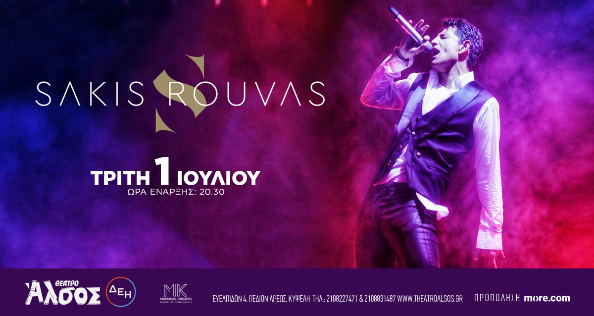Με πολύ κέφι, χορό και αμέτρητες επιτυχίες που έχουμε λατρέψει ο Σάκης Ρουβάς θα μας ταξιδέψει για ένα βράδυ την Τρίτη 1η Ιουλίου στο ΔΕΗ Θέατρο Άλσος χαρίζοντάς μας μοναδικές στιγμές που θα μείνουν αξέχαστες!