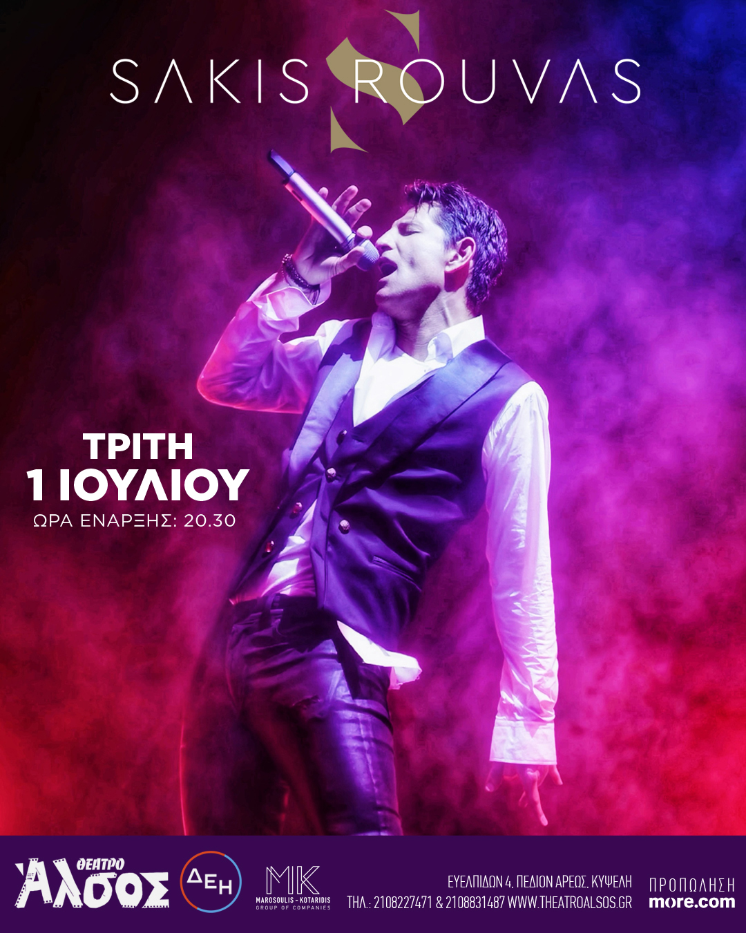 Ο ένας και μοναδικός Σάκης Ρουβάς έρχεται στο ΔΕΗ Θέατρο Άλσος την Τρίτη 1η Ιουλίου για ένα εκρηκτικό live show γεμάτο μουσική, τραγούδια, έρωτα και συναίσθημα, όπως μόνο αυτός ξέρει. Ο κορυφαίος Έλληνας σταρ είναι έτοιμος να μαγέψει και να απογειώσει το κοινό του για άλλη μια φορά με τις μουσικές του επιτυχίες, την αστείρευτη ενέργειά του, το πάθος του επί σκηνής με ένα εκπληκτικό show ερμηνεύοντας αγαπημένα τραγούδια που έχουν αφήσει εποχή απ’ όλες τις δεκαετίες της καριέρας του!