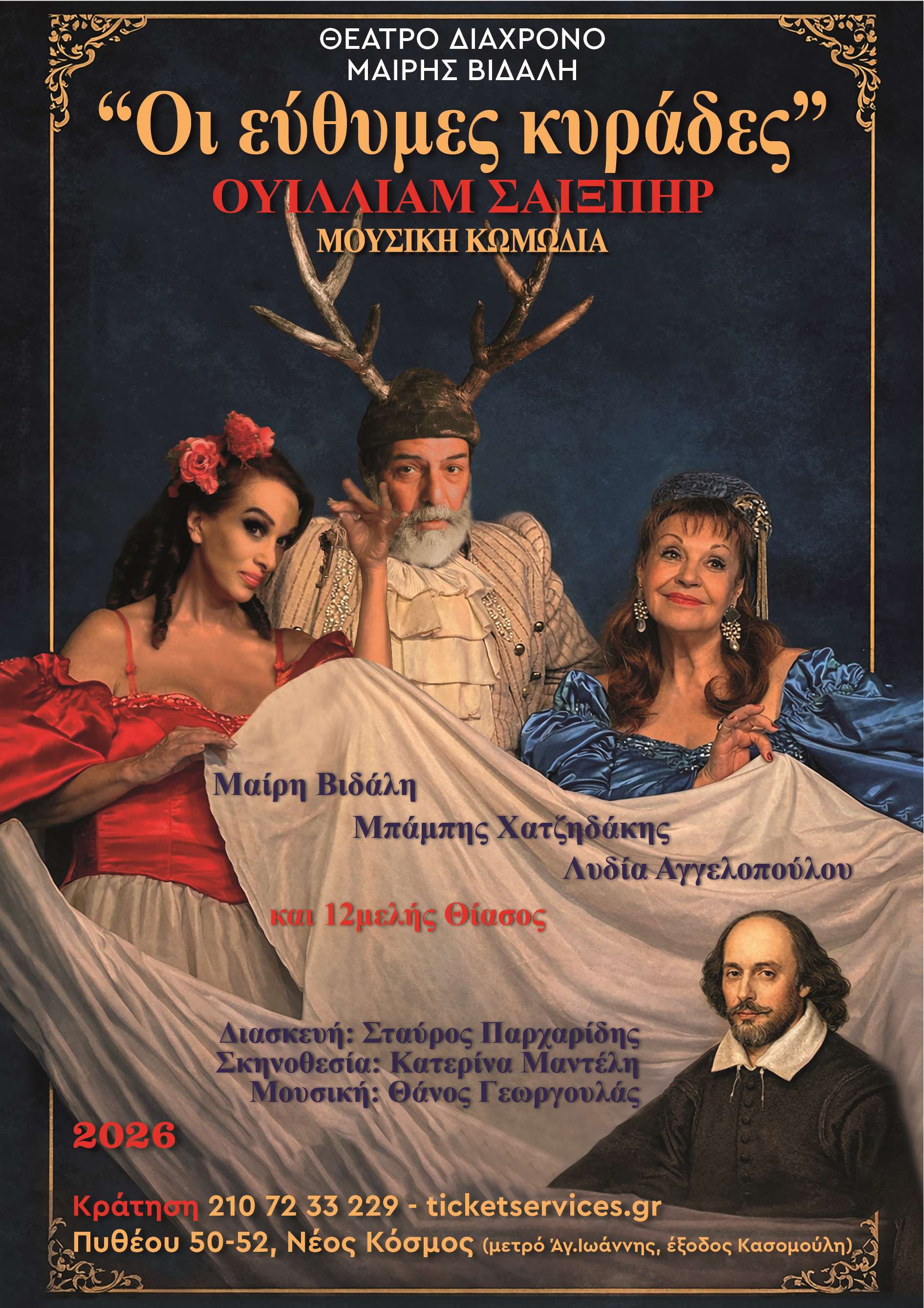 Σαίξπηρ ερμηνεύει για 4η φορά η Μαίρη Βιδάλη και αυτή τη φορά στο θέατρο της. Από το Σάββατο 31 Ιανουαρίου στο ΔΙΑΧΡΟΝΟ ΘΕΑΤΡΟ ΜΑΙΡΗΣ ΒΙΔΑΛΗ, θα απολαύσουμε τη σπαρταριστή κωμωδία «Οι εύθυμες κυράδες (του Ουίνζορ)» του Ουίλιαμ Σαίξπηρ σε μορφή μιούζικαλ.