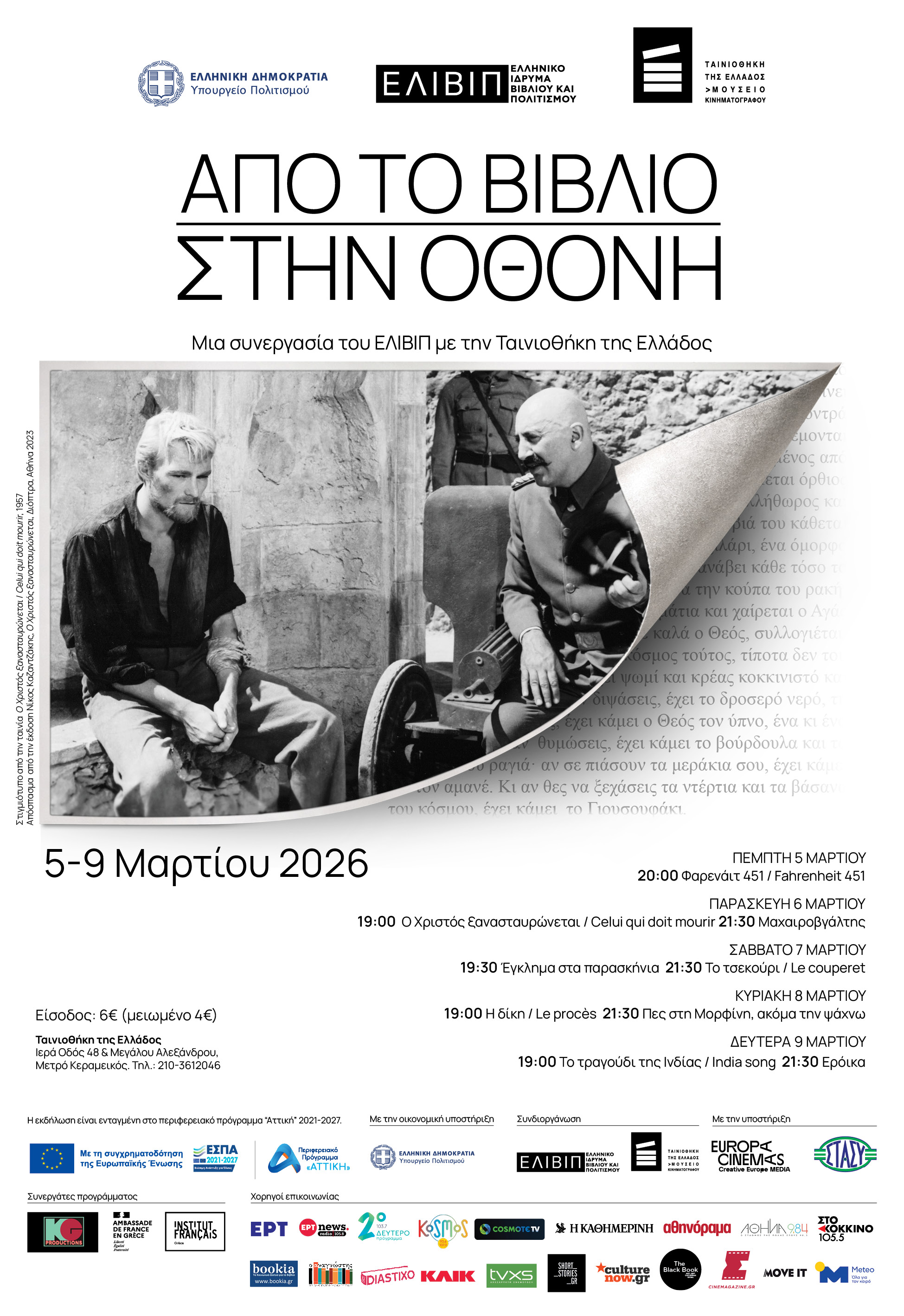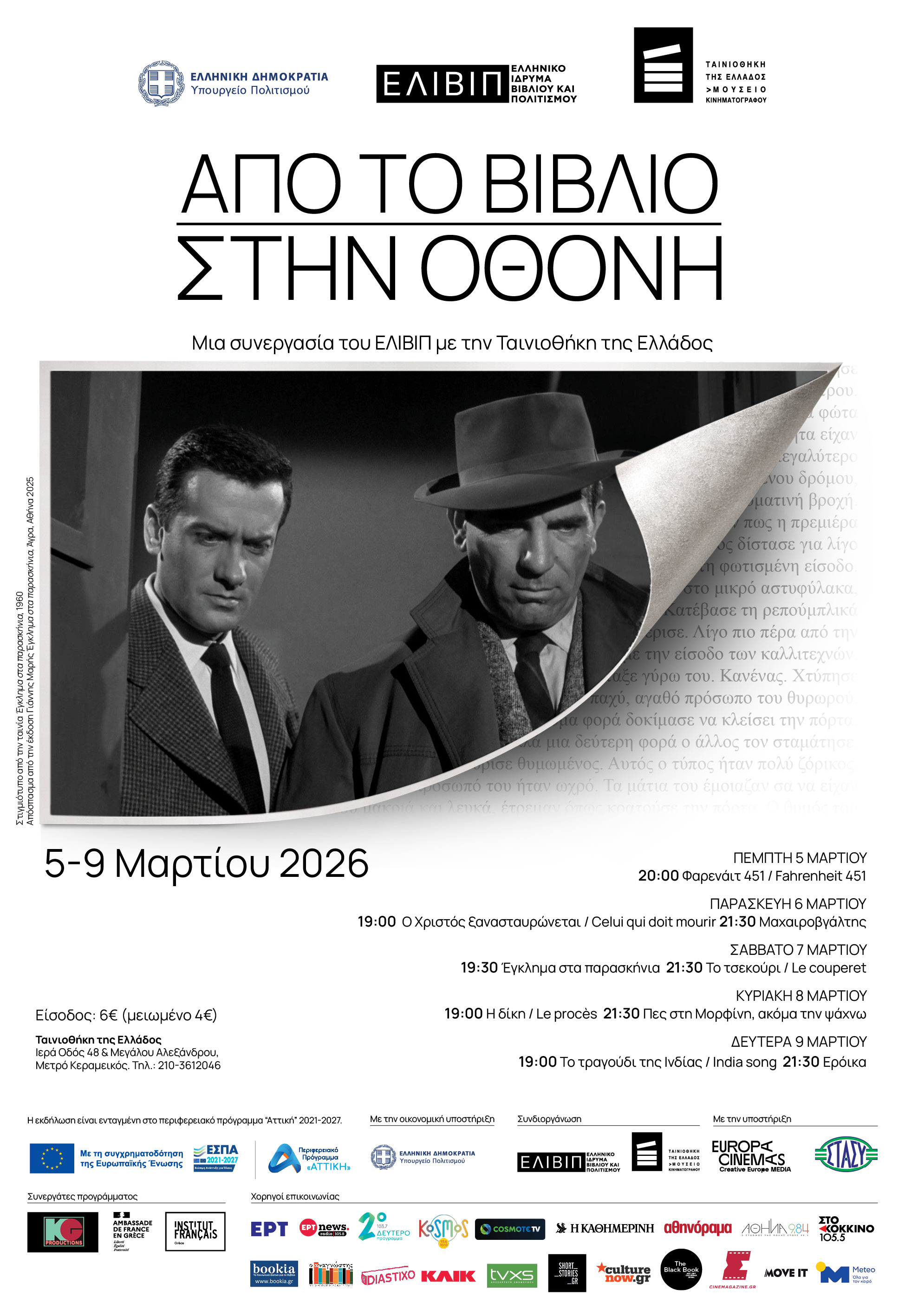 «Από το βιβλίο στην οθόνη». Όταν οι σελίδες γίνονται καρέ… Από τις 5 έως και τις 9 Μαρτίου, τo Ελληνικό Ίδρυμα Βιβλίου και Πολιτισμού (ΕΛΙΒΙΠ) και η Ταινιοθήκη της Ελλάδoς, μας προσκαλούν σε ένα μοναδικό αφιέρωμα που συνδυάζει λογοτεχνία και κινηματογράφο, με 9 ταινίες βασισμένες σε μυθιστορήματα. Μεγάλοι δημιουργοί όπως οι Όρσον Γουέλς, Φρανσουά Τριφό, Μιχάλης Κακογιάννης, Ζιλ Ντασέν και Κώστας Γαβράς ζωντανεύουν βιβλία των Νίκου Καζαντζάκη, Φραντς Κάφκα, Κοσμά Πολίτη και άλλων σπουδαίων λογοτεχνών.
