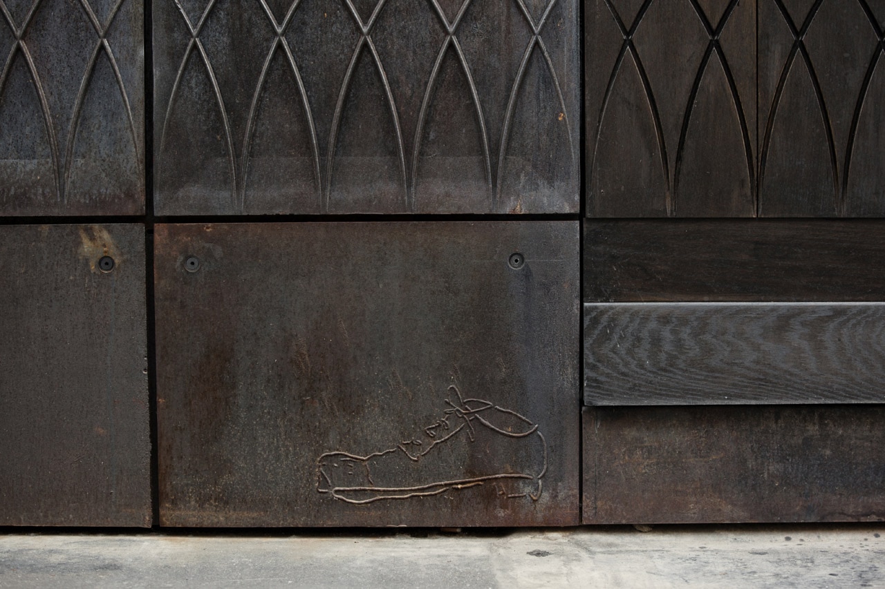 Curved windows project from the darkly textured iron as luminous vitrines, with a nod to the curved glass of the nearby arcades. A secret door of stained oak lies flush with the cast iron panels: the inverted carving of the timber recalls the mould and sand bed prepared for the molten metal.