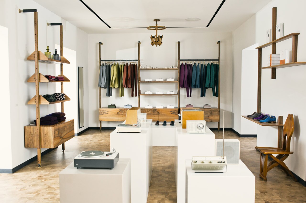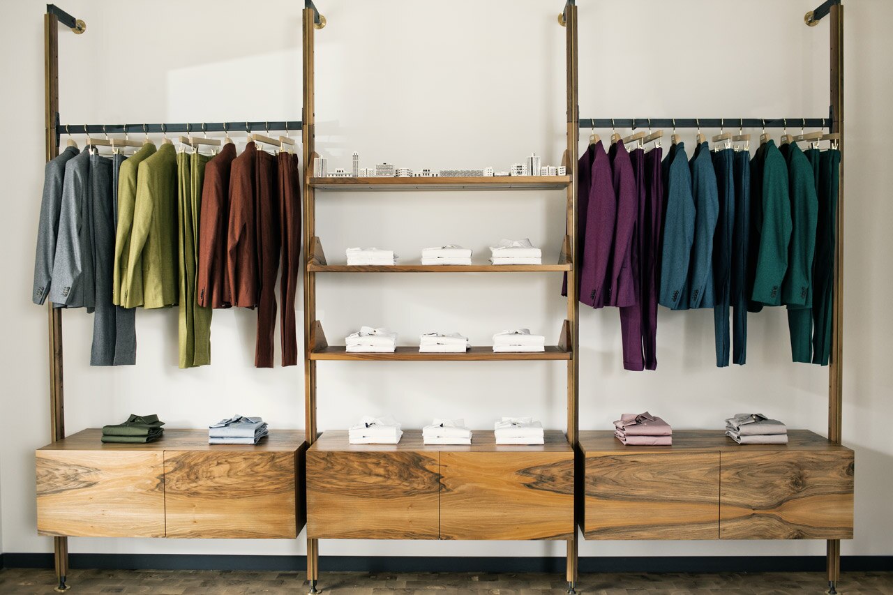 The men’s area is modernist and masculine in style Organic wood and bronze furniture and fixtures have been custom made and sit on an end-grain wood block floor and natural limestone. A black steel circular rail displays tailoring and three full-length windows overlook a small garden with skylights at the rear.