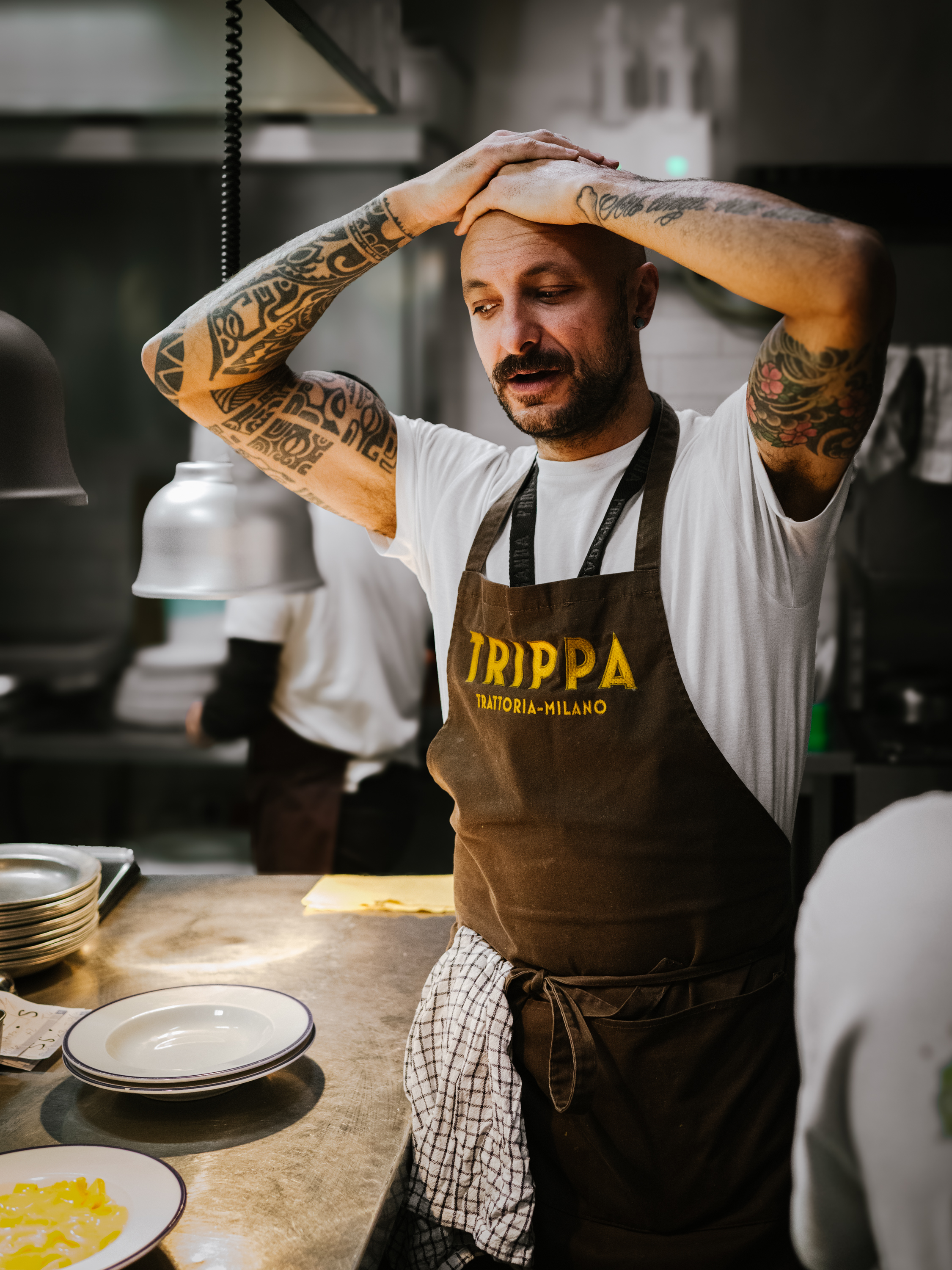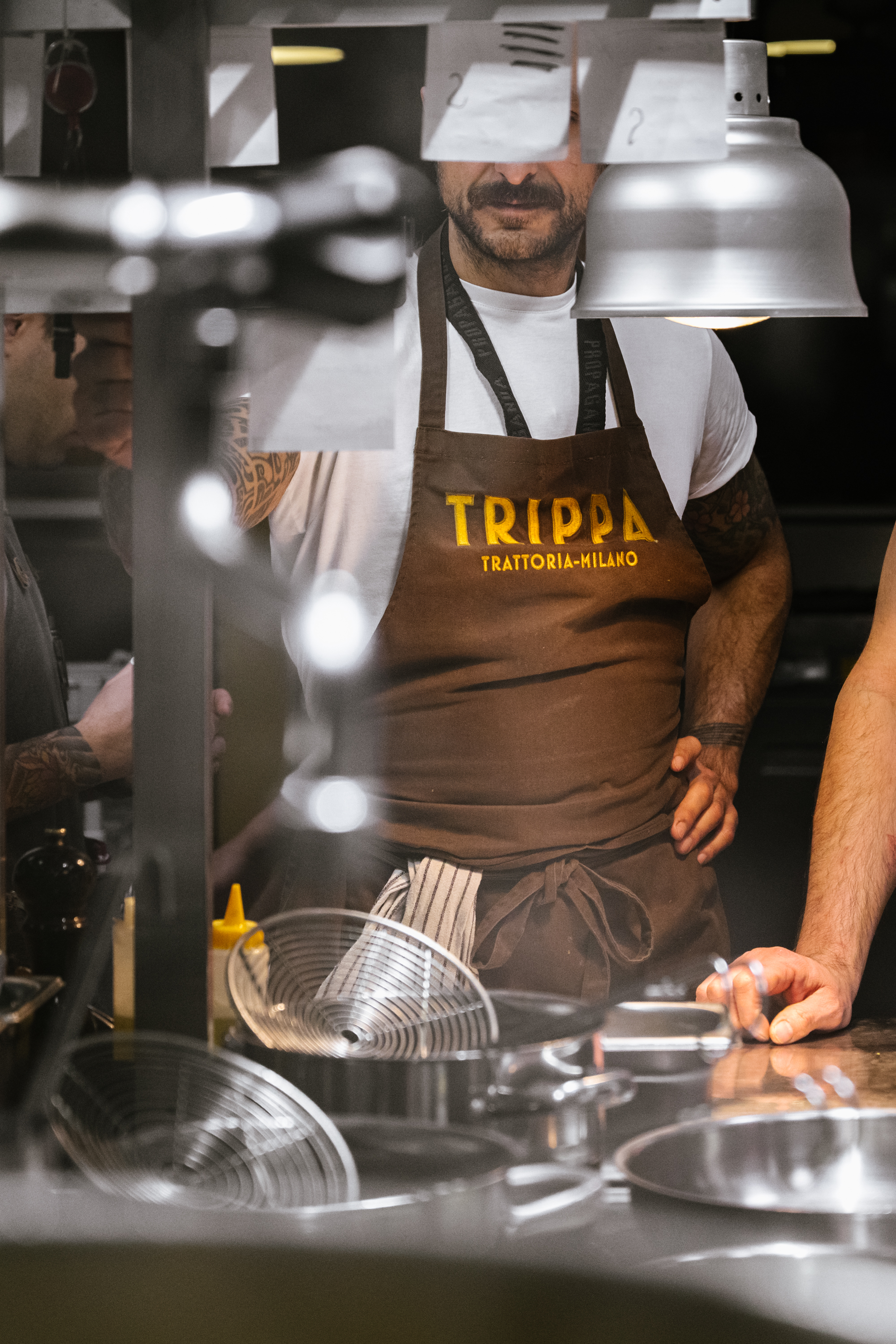 Στον πυρήνα της κουζίνας του βρίσκονται off cuts από κρέατα και ψάρια, εντόσθια, άγρια χόρτα, φρούτα και χειροποίητα ζυμαρικά. Το μενού στην Trippa μοιάζει με ζωντανό ημερολόγιο της αγοράς, αφού στήνεται καθημερινά με βάση ό,τι είναι διαθέσιμο. Μπορεί να εμφανιστούν από τηγανητός πατσάς (ένα από τα πιο εμβληματικά πιάτα του), χειροποίητα λουκάνικα, αρνίσια συκωταριά με μέντα και πεκορίνο, ψητό μεδούλι, φλαν ρικότας και μορταδέλας, ένα από τα καλύτερα vitello tonnato της χώρας, αλλά και χορτοφαγικά πιάτα όπως πουρές από κουκιά με πικραλίδα. Όλα έχουν μια κοινή γραμμή: ευθύτητα, νοστιμιά, «καθαρές» γεύσεις. Φαγητό που δεν προσπαθεί να αποδείξει κάτι. Απλώς καταφέρνει να είναι σπουδαίο.
