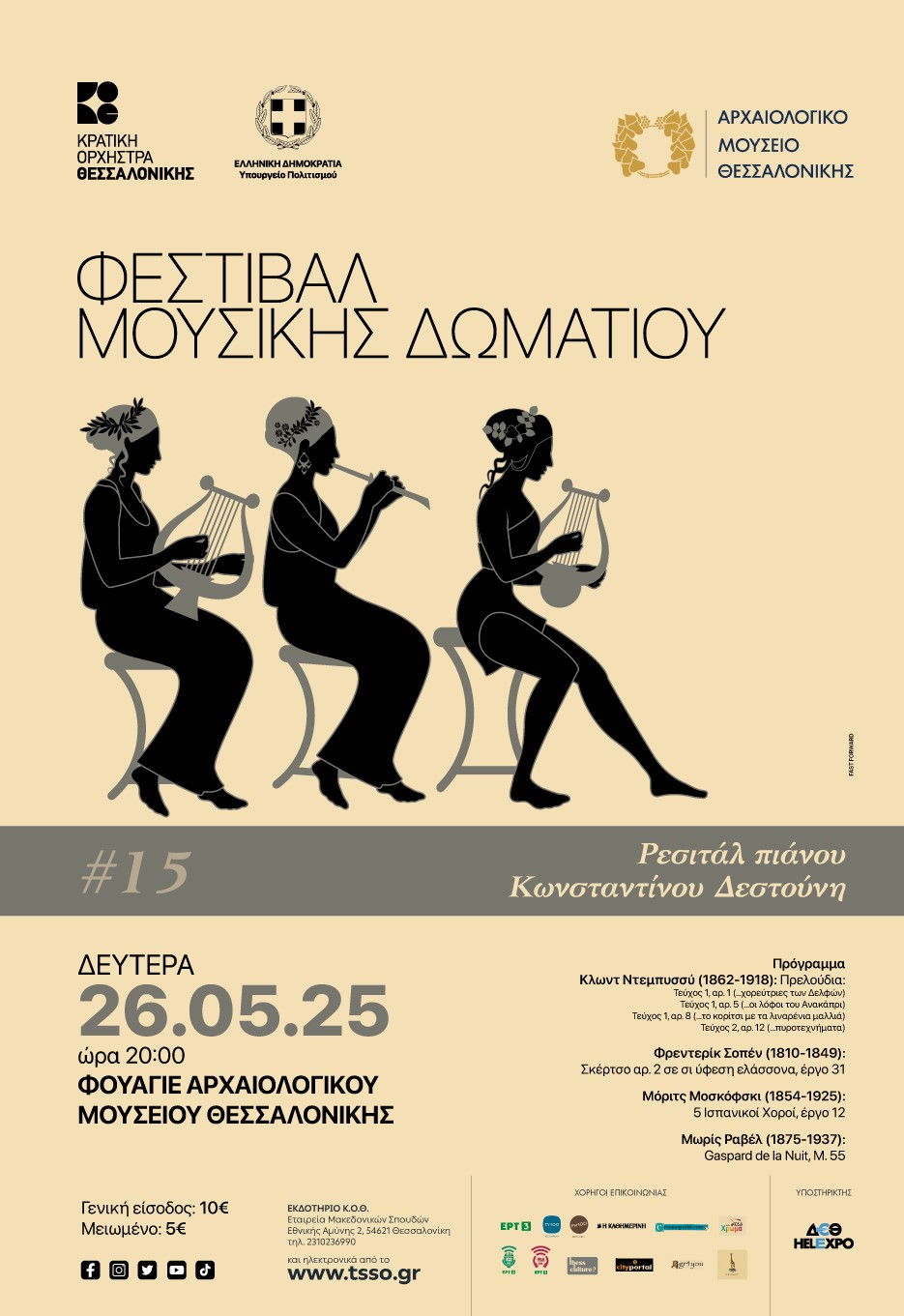 Το Φεστιβάλ Μουσικής Δωματίου που συνδιοργανώνουν η Κρατική Ορχήστρα Θεσσαλονίκης και το Αρχαιολογικό Μουσείο Θεσσαλονίκης, με την υποστήριξη του Υπουργείου Πολιτισμού, συνεχίζεται με ένα ρεσιτάλ πιάνου του Κωνσταντίνου Δεστούνη που περιλαμβάνει έργα Ντεμπυσσύ, Σοπέν, Μοσκόφσκι και Ραβέλ.